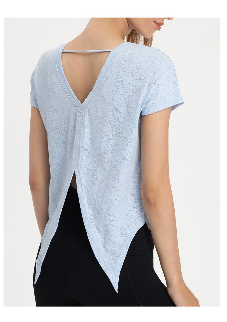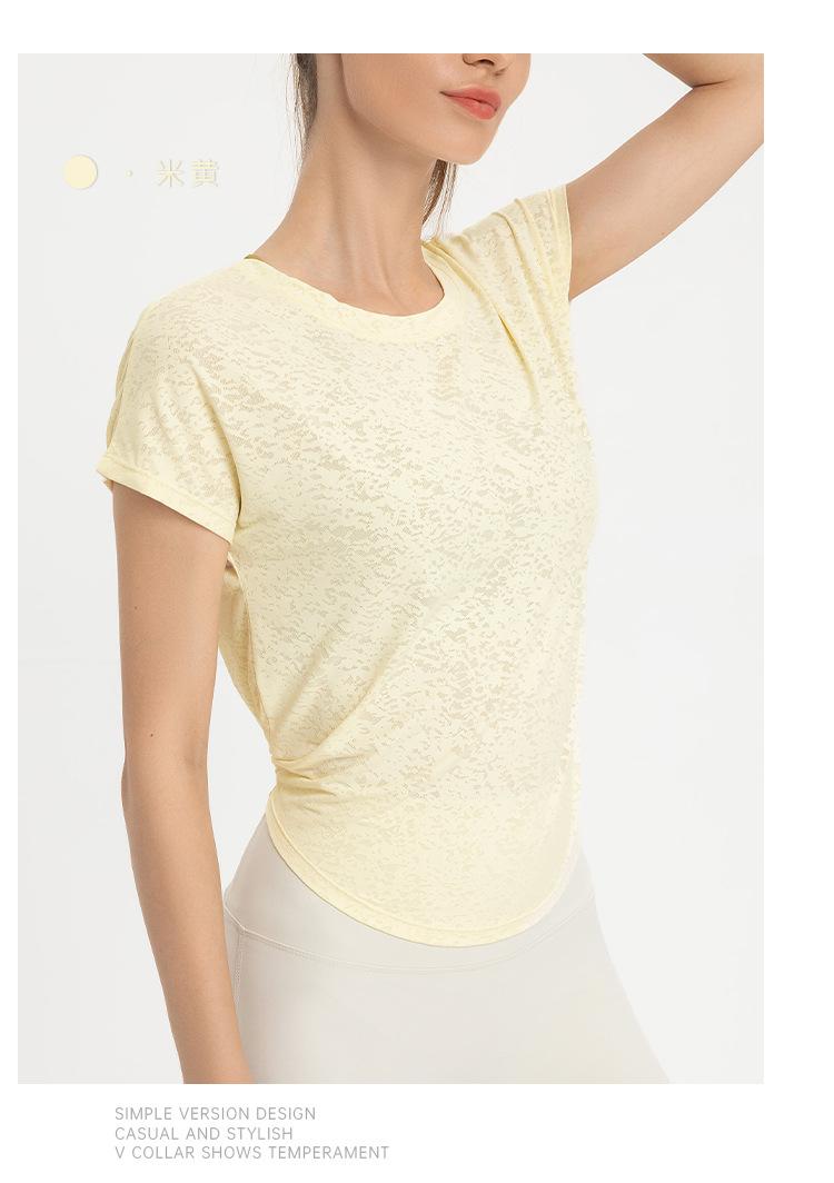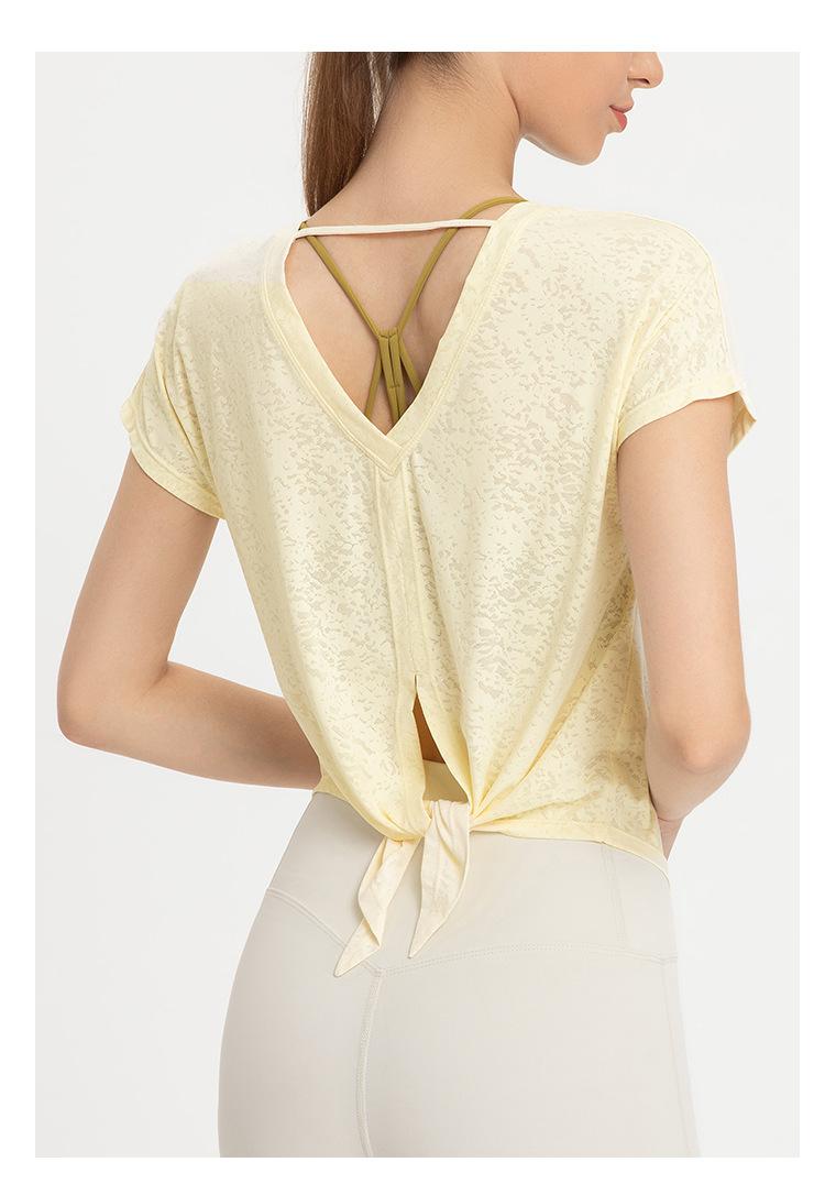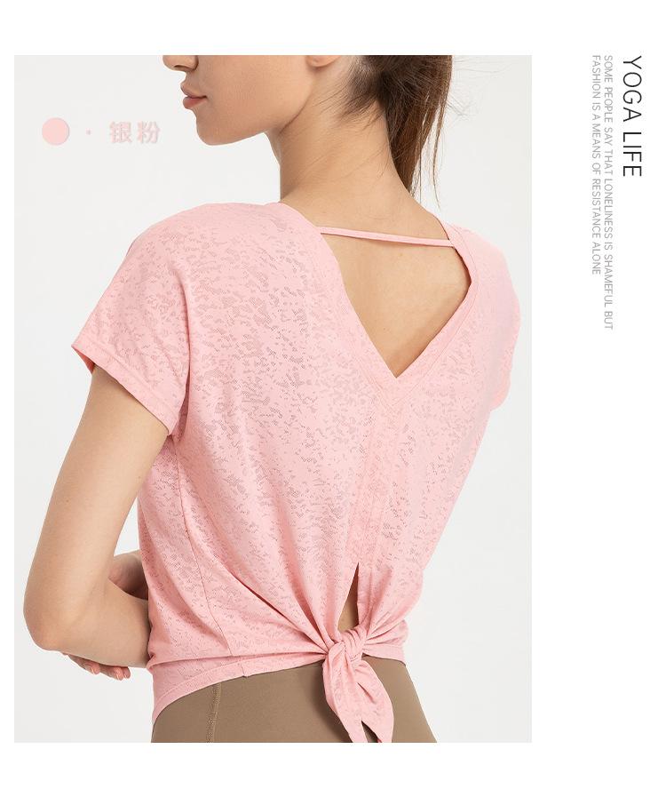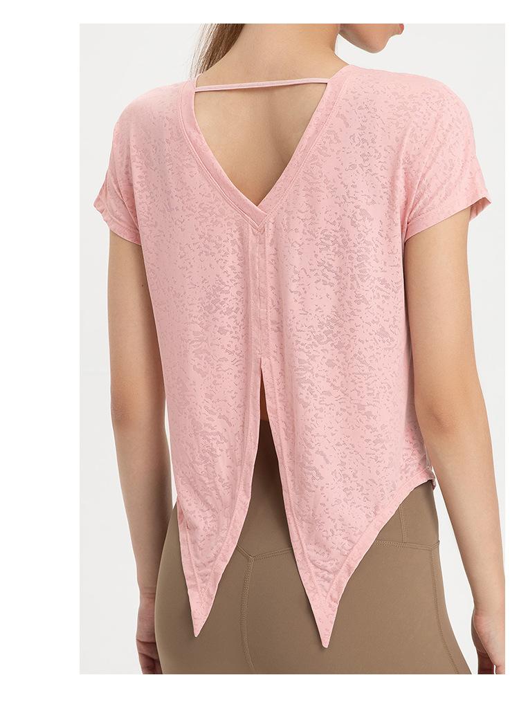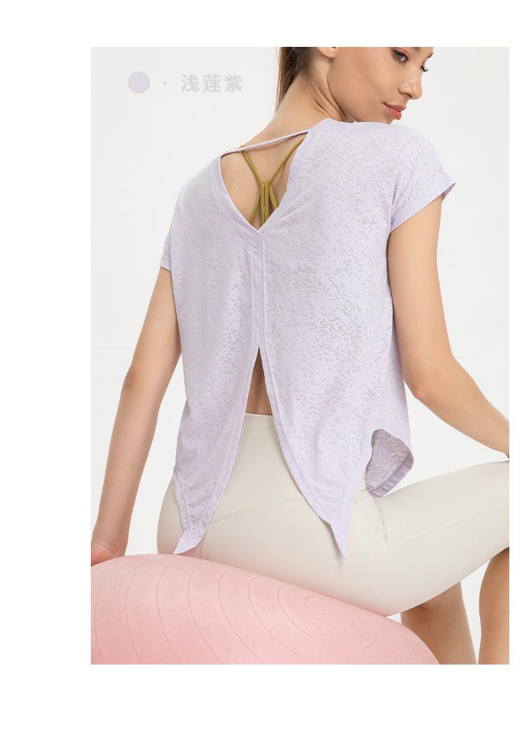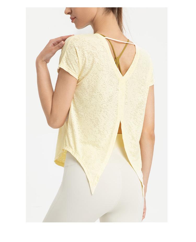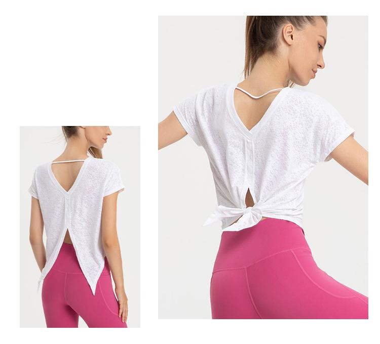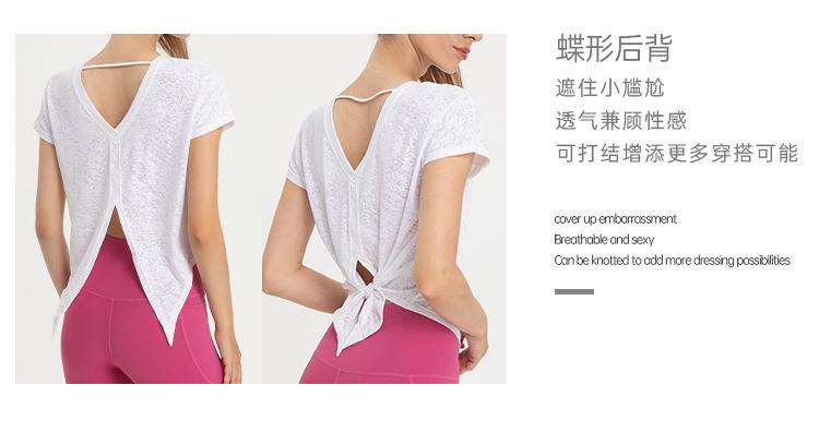 Blusa deportiva de manga corta para yoga, holgada, de secado rápido, ligera, transpirable, con espalda descubierta y abertura en jacquard.