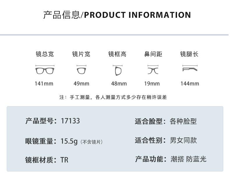 Danyang gafas ojo de gato mujer anti luz azul retro montura de gafas lisas marrón frío miopía montura TR90 de alta gama ¥8.00 Compre ya | T7157 nueva versión coreana ins montura grande gafas para miopía hombres y mujeres montura cuadrada montura de gafas lisas sin maquillaje net red gafas delgadas ¥11.00 Compre ya | Nuevo estilo anteojos lisos estilo caliente moda callejera disparo transfronterizo ojo de gato Europeo y Americano montura óptica color degradado anti-luz azul TQ5740 ¥13.00 Compre ya | T7182 Versión coreana de montura redonda delgada ligera para miopía para mujer, maquillaje rojo Xiaohongshu literario, gafas planas de tendencia para hombre ¥12.00 Compre ya | ||