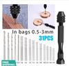 set de 62 piezas en cartón(Peso 350g): 1 mango negro, 48 brocas helicoidales de tamaño completo (mismas especificaciones que el juego de 49 piezas de brocas helicoidales manuales), 10 mini brocas limitadas, 1 abrazadera grande de aleación de aluminio, 2 piezas de papel de lija