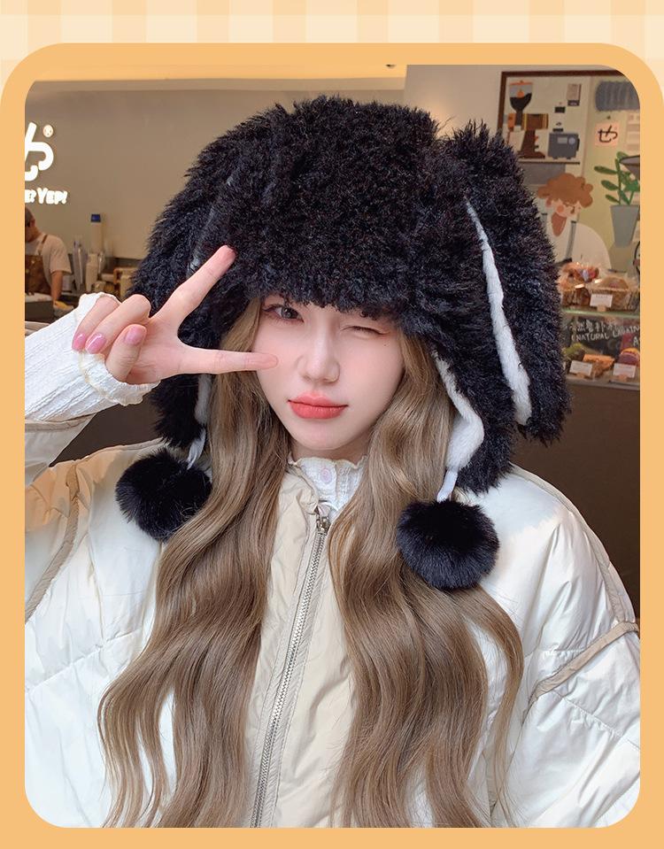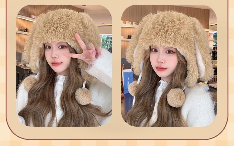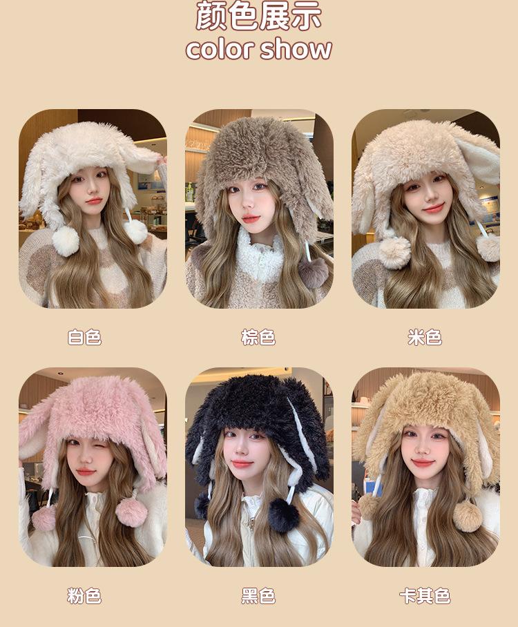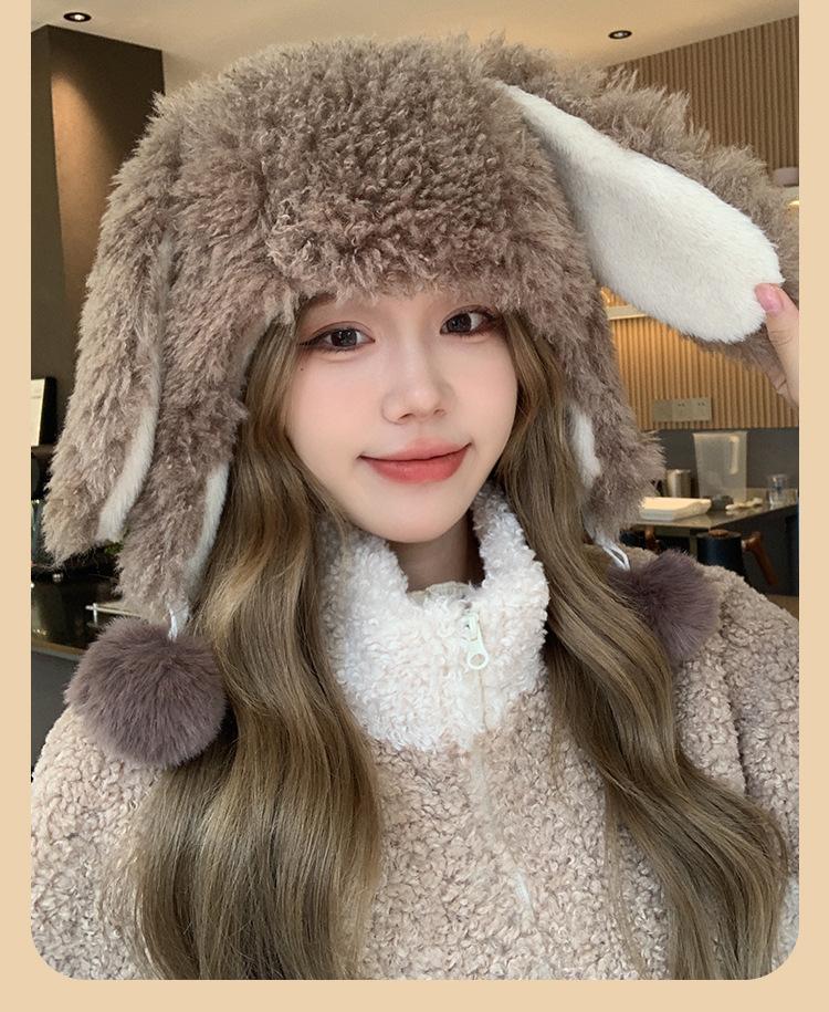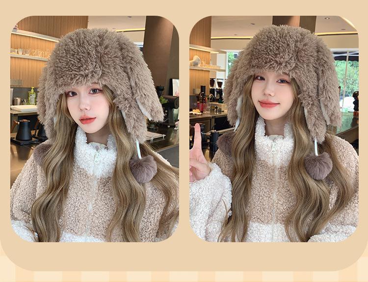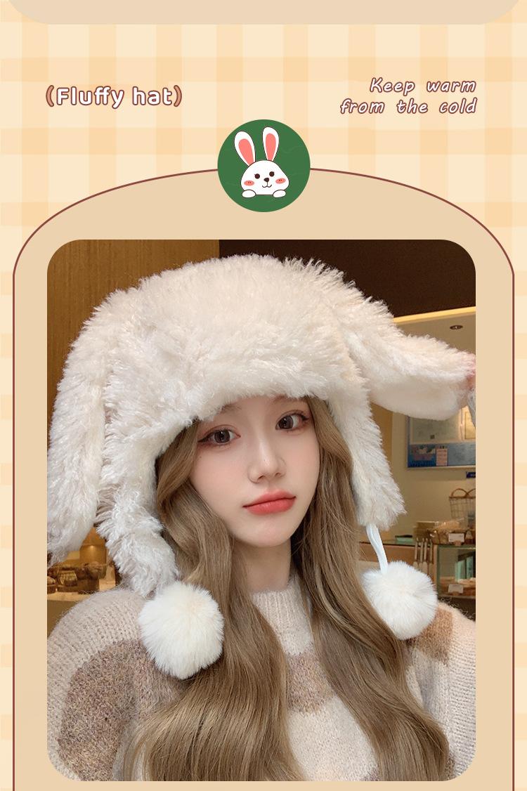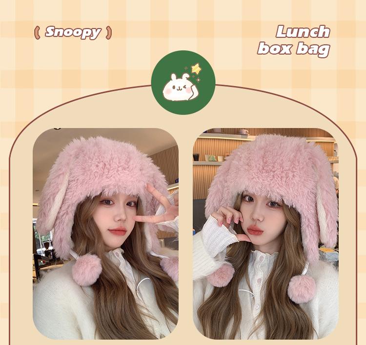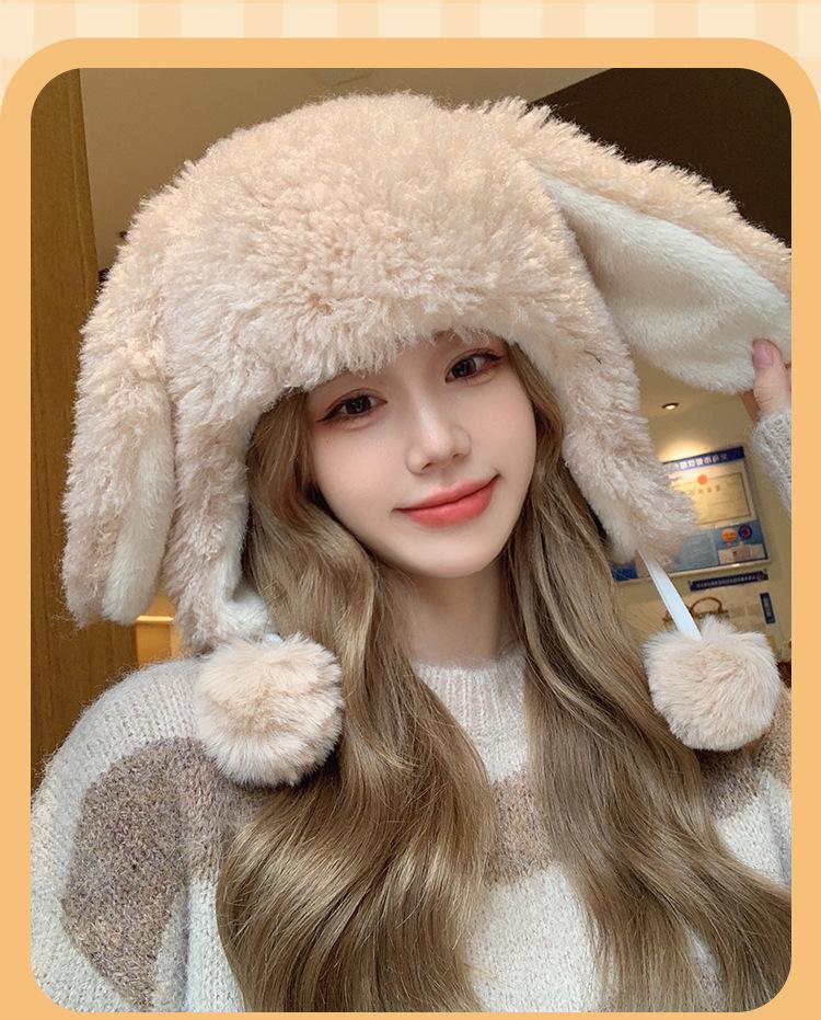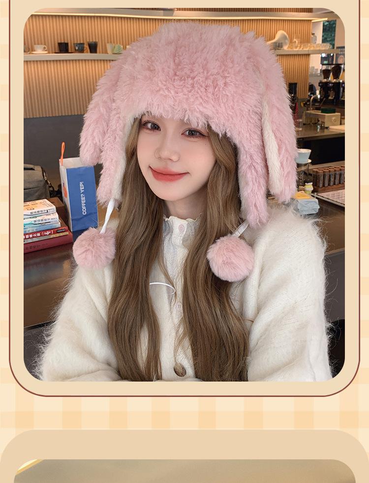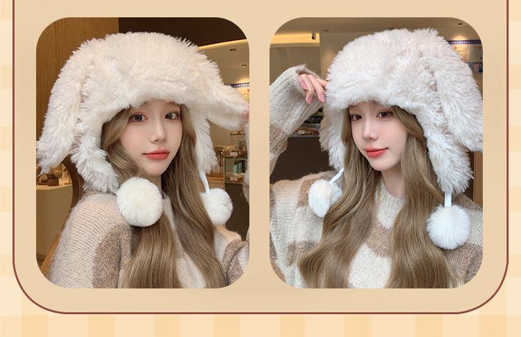 Invierno Engrosado Blanco Felpa Orejas de Conejo de Dibujos Animados Gorro Lei Feng para Mujer Reductor de Edad Dulce Lindo Cálido Protección para las Orejas Gorro Pulóver