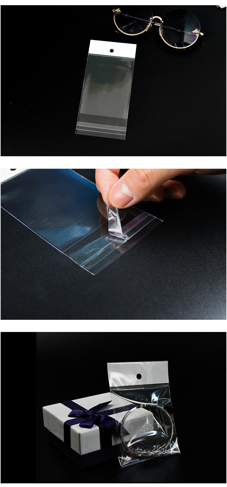 Bolsa de cartón con película de perla OPP, con orificio para colgar, autoadhesiva, para embalaje de joyas, transparente, autosellada.