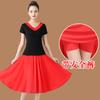 Black and red V-neck short sleeve shirt + red mid-skirt with pants