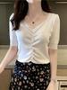 Camiseta de Manga Corta de Seda de Hielo para Mujer, Nuevo Estilo Verano 2026, Cuello en V Moderno, Top de Punto Ajustado de Cintura Alta Estilo Francés
