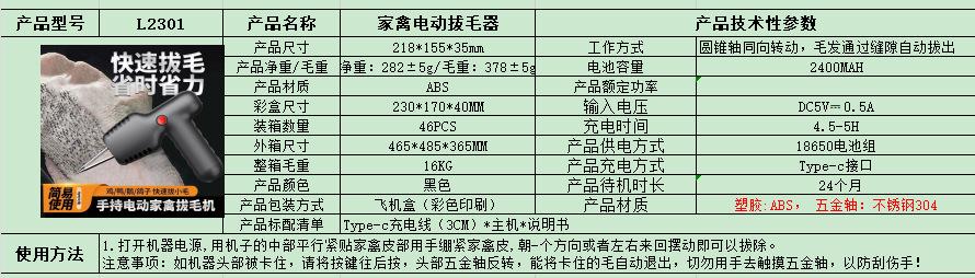 Esta desplumadora adopta un diseño recargable y es fácil de operar. Puede desplumar rápida y eficientemente plumas de pato y ganso, limpiar, completa y eficazmente eliminar el vello fino, y es pequeña y portátil.