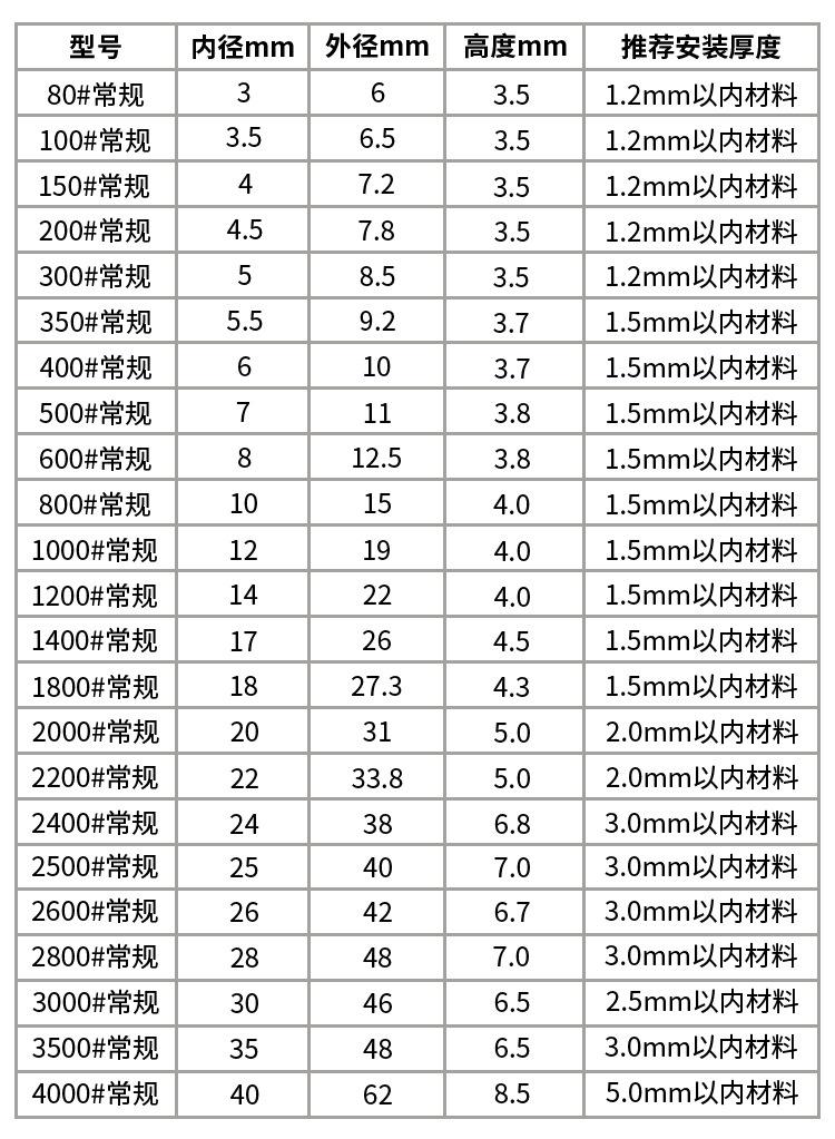 80# inner diameter 3.0mm, 100# inner diameter 3.5mm, 150# inner diameter 4.0mm, 200# inner diameter 4.5mm, 300...