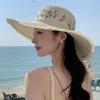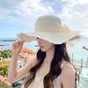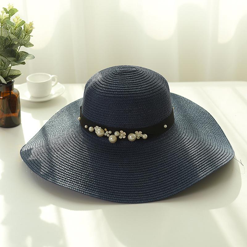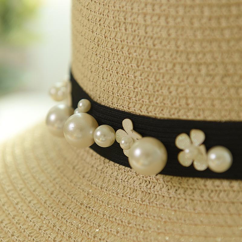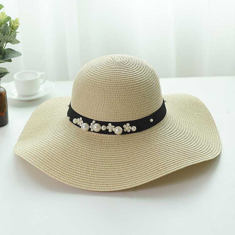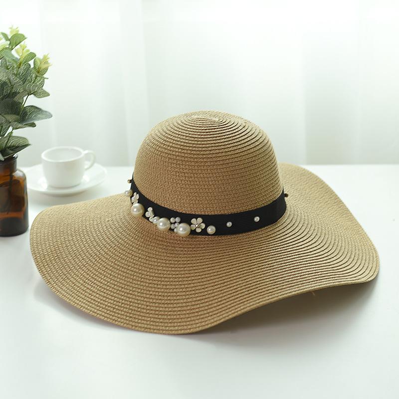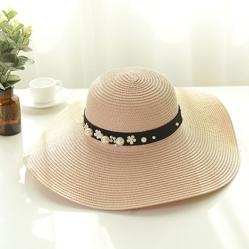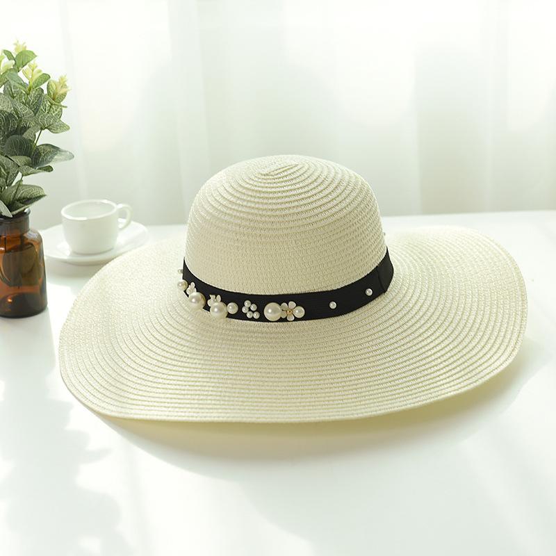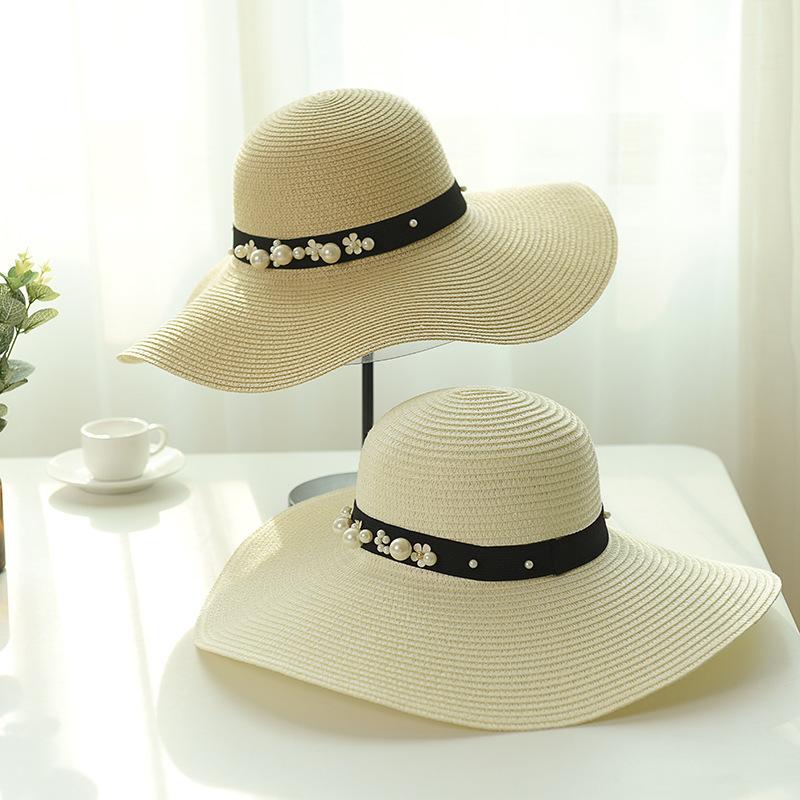 Sombrero de Playa de Verano de Ala Ancha con Protección Solar para Dama, Sombrero de Paja Elegante con Cinta de Perlas, Sombrero de Princesa de Alta Gama con Parasol