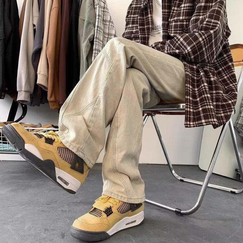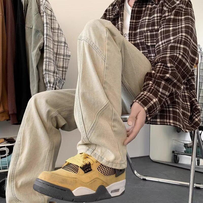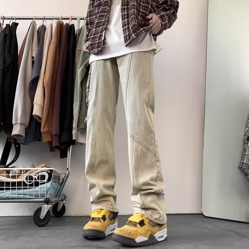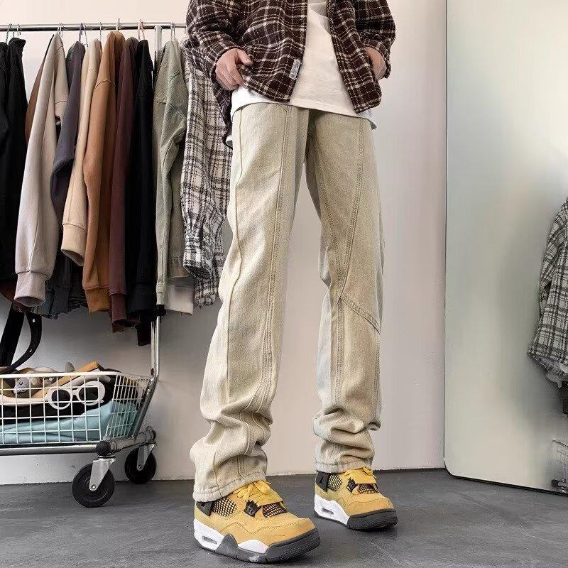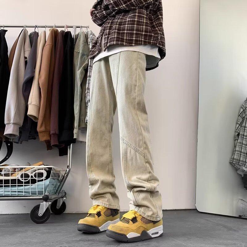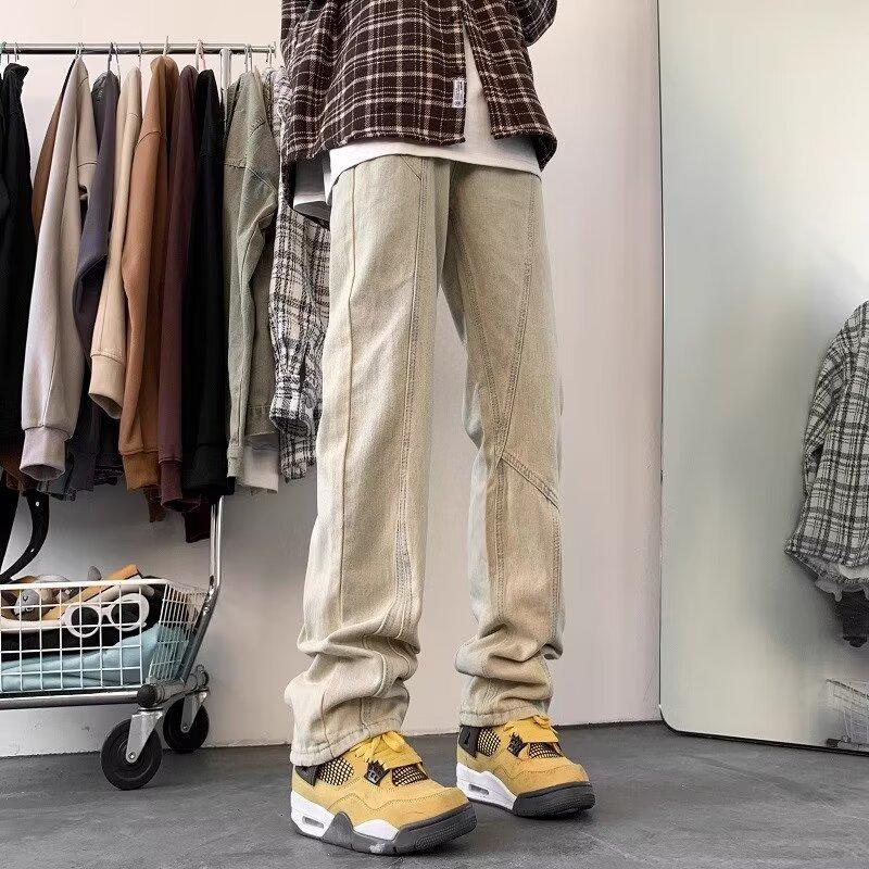 Hermosa moda High Street jeans lavados teñidos de barro amarillo diseño de línea marca de moda pantalones rectos ajustados 2024