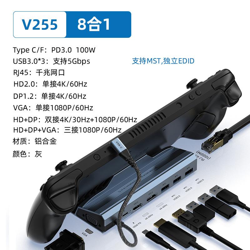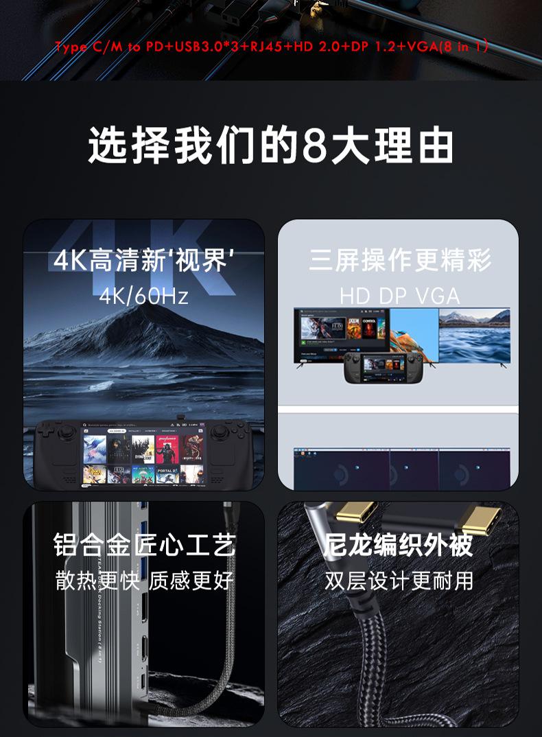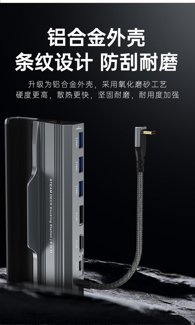 Aplicación del producto: La primera generación con tipo Cinterfaz de protocolo estándarvaporDespués de conectar la consola de juegos portátil a través de esta estación de acoplamiento,1. Convierte la señal de interfaz tipo C a señal HDMI y admite 4K*2K 6Salida de 0 Hz; 2. Convierte la señal de interfaz tipo C a señal VGA (1080P/60Hz); 3. Convierte la señal de interfaz tipo C en señal DP (4K/60H)z);4.Admite conexión de puerto de red Gigabit;5.Conecte unidades flash USB, discos duros móviles, teclados, ratones, etc. al dispositivo, admitiendo la fuente de alimentación ascendente PD3.0, solucionando así el problema de pocas interfaces del dispositivo.