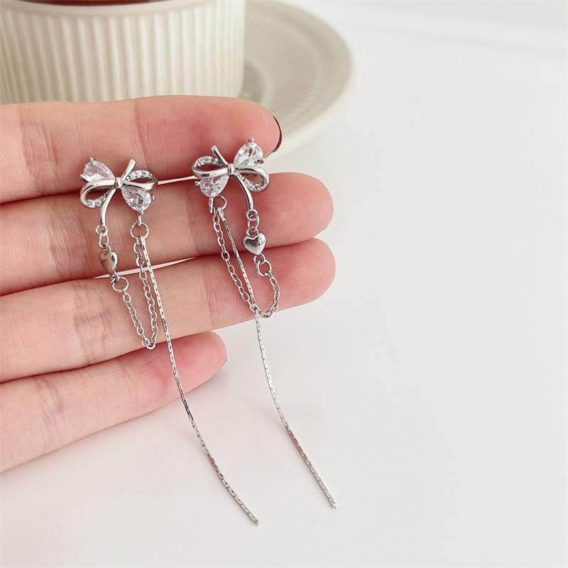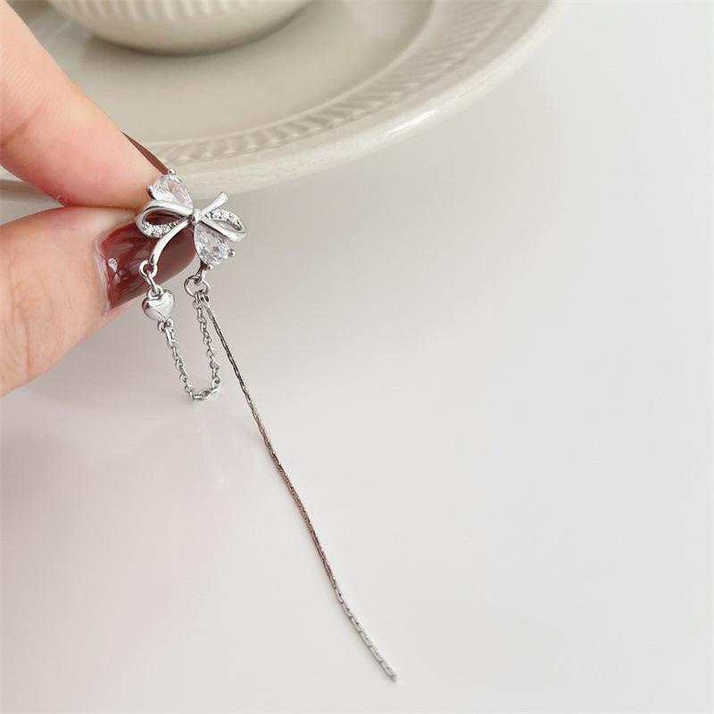 Pequeño y exquisito diseño de clip para hueso de la oreja con borla de lazo de micro incrustaciones de circonita, sensación de amor pequeño, aretes de lujo ligero al por mayor