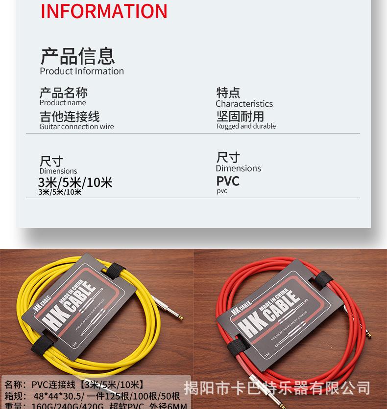 Cable de PVC para guitarra HK de 3 m/5 m/10 m, para caja de guitarra eléctrica folk, bajo y guitarra eléctrica.
