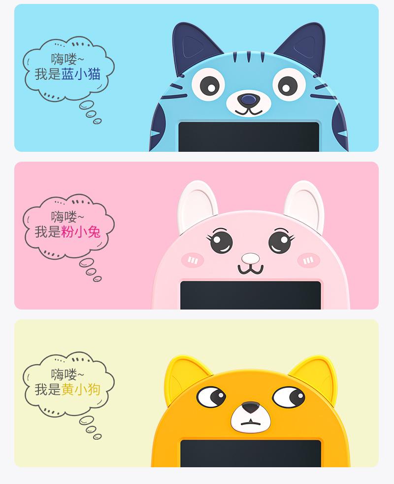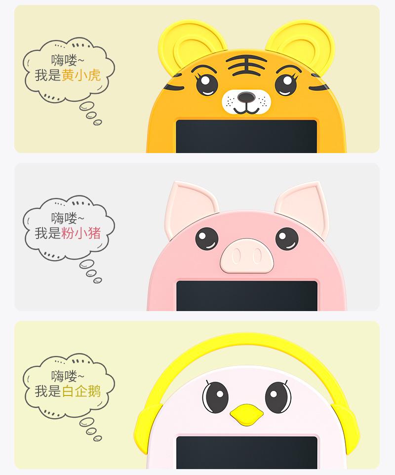 Huang Xiaohu, Blue Kitten, Yellow Puppy, White Penguin, Grey Koala, Pink Piglet, White Panda, Powder bunny, Cyclops Green