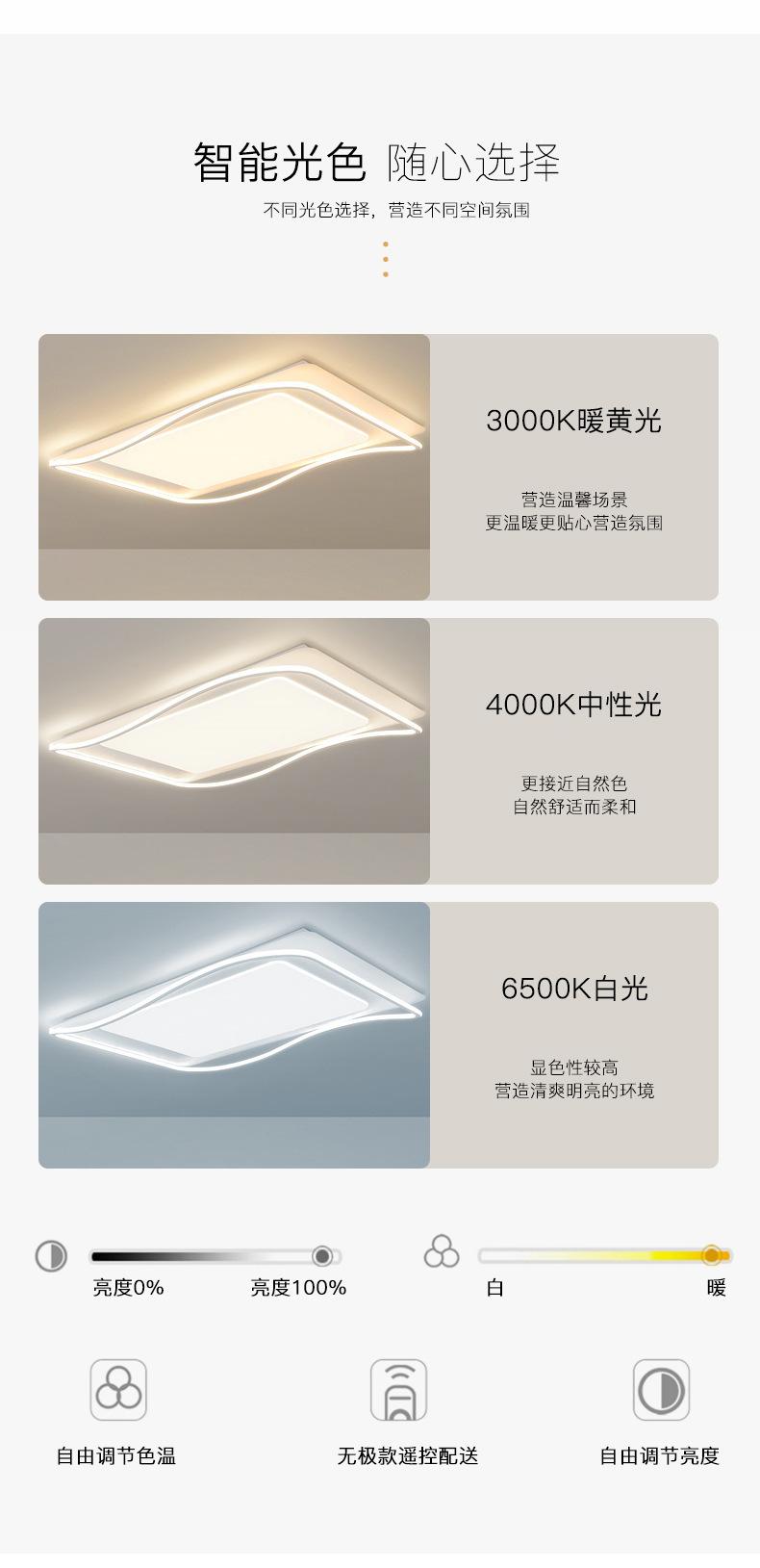 Three-color light changing, Electrodeless dimming with remote control, Supports Tmall smart models, Support mi Xiaoai smart style