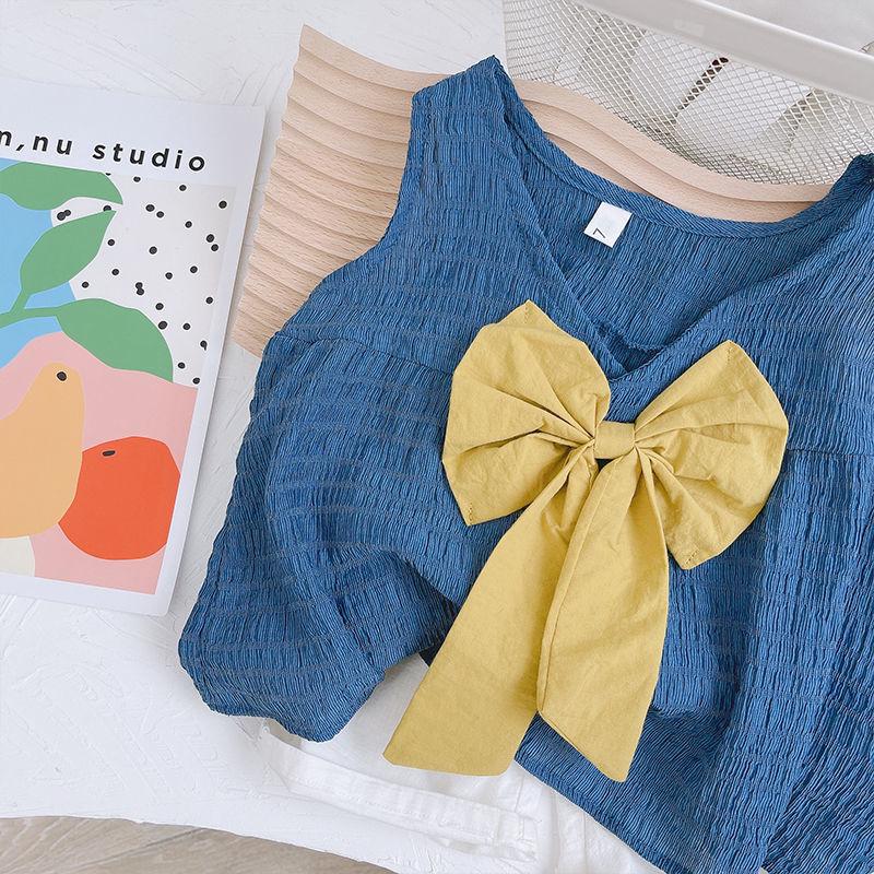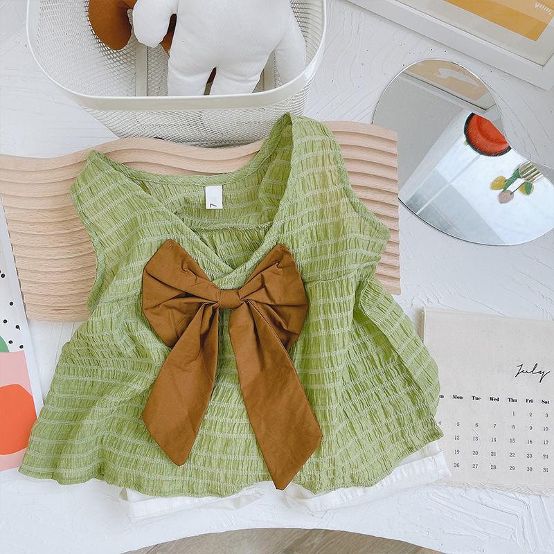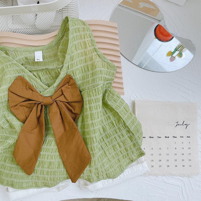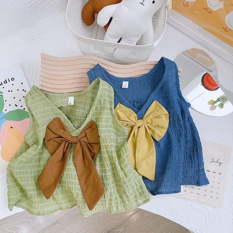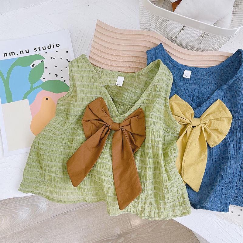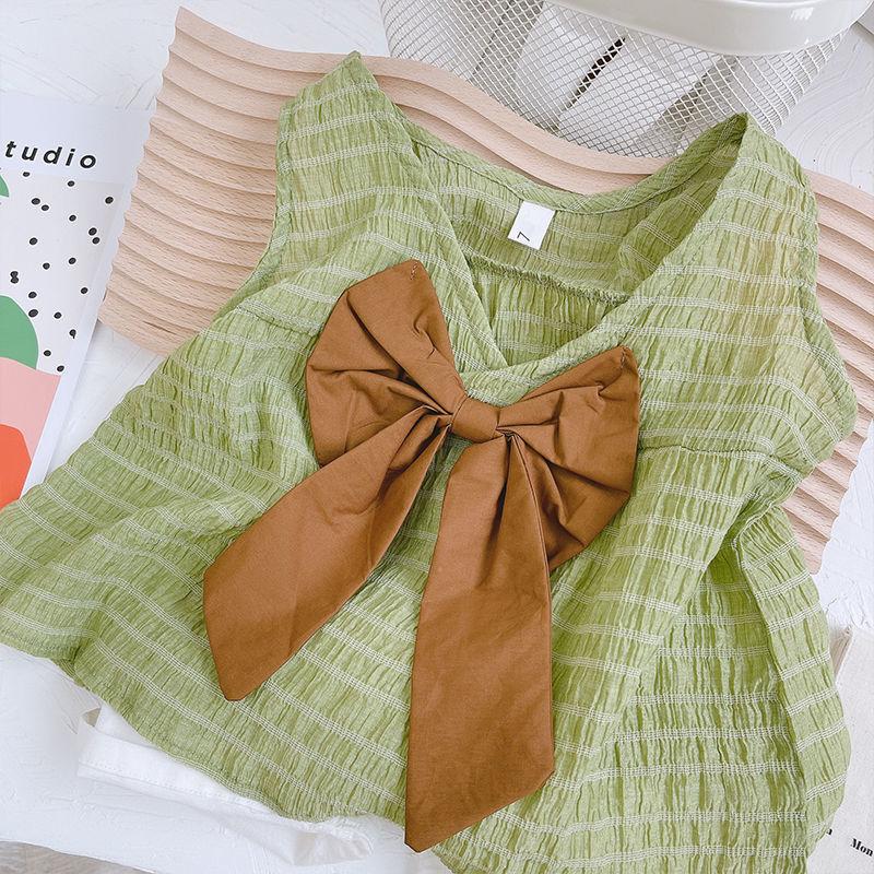 Chaleco de verano para niñas, popular en línea, para bebés, personalizado, de moda, estilo coreano, con escote en V y lazo, sin mangas, dulce top