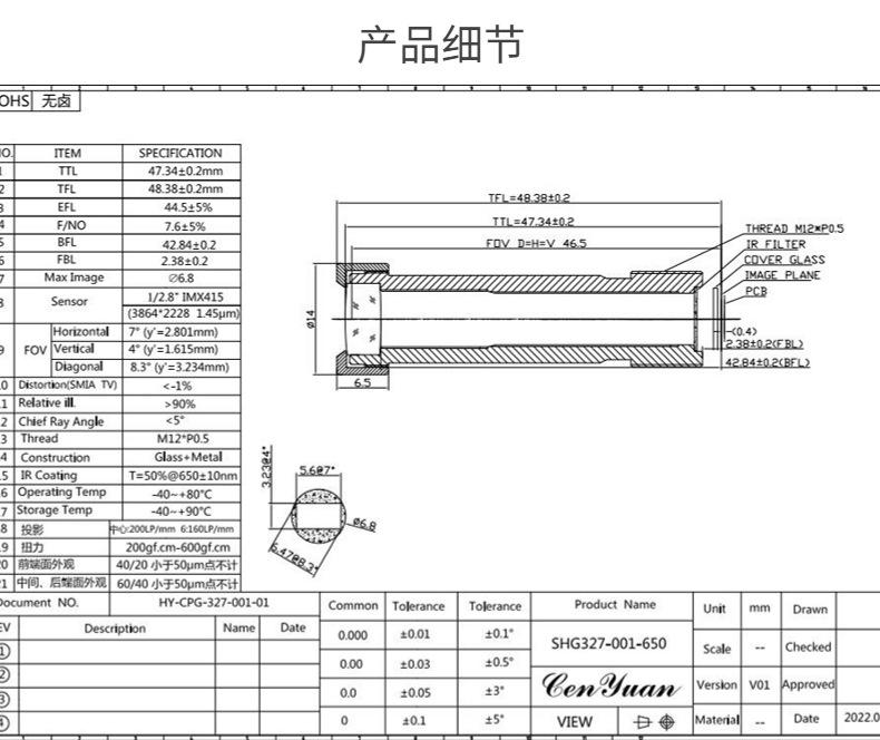 Lente de telescopio microscópico de 1/2.8" distancia focal 44.5 mm apertura 7.6 alto píxel