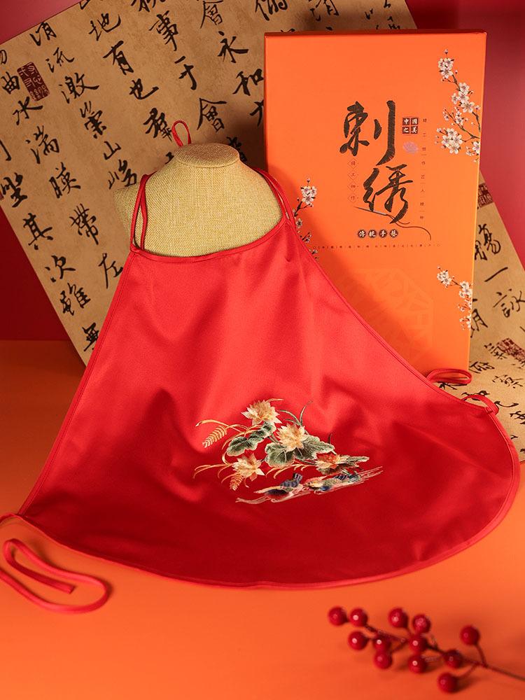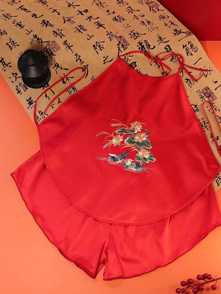 Bolsillo de Vientre Bordado Pesado Pato Mandarín Rojo Bordado Su Bolsillo de Vientre Ropa Interior Estilo Chino Estilo Antiguo Ropa para el Hogar para Mujer Traje de Pijama