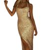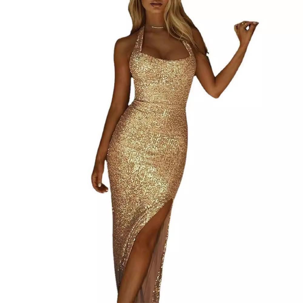 2025 Nuevo Primavera Verano Ropa Transfronteriza Europea y Americana Nueva Falda Larga Sexy de Fiesta con Lentejuelas y Abertura Dorada