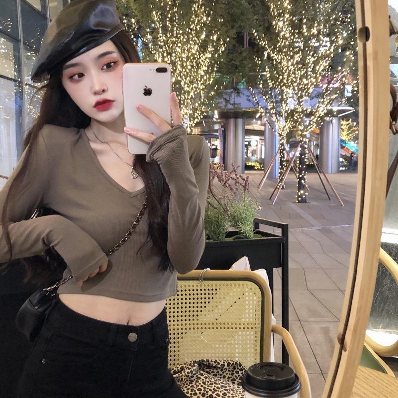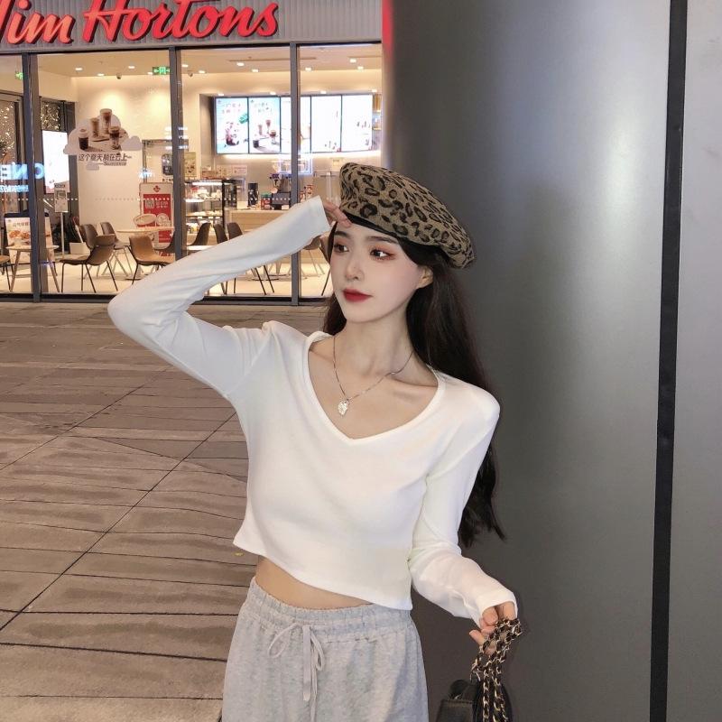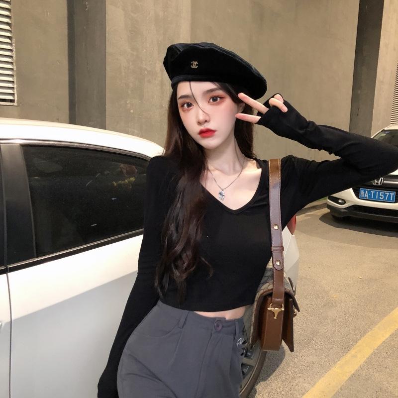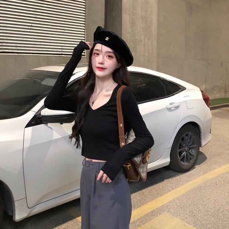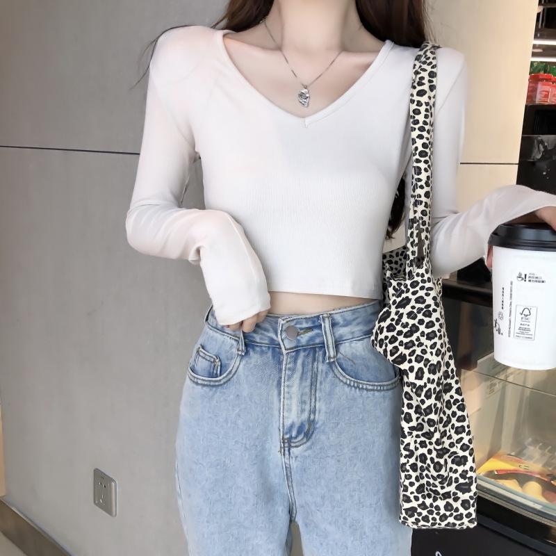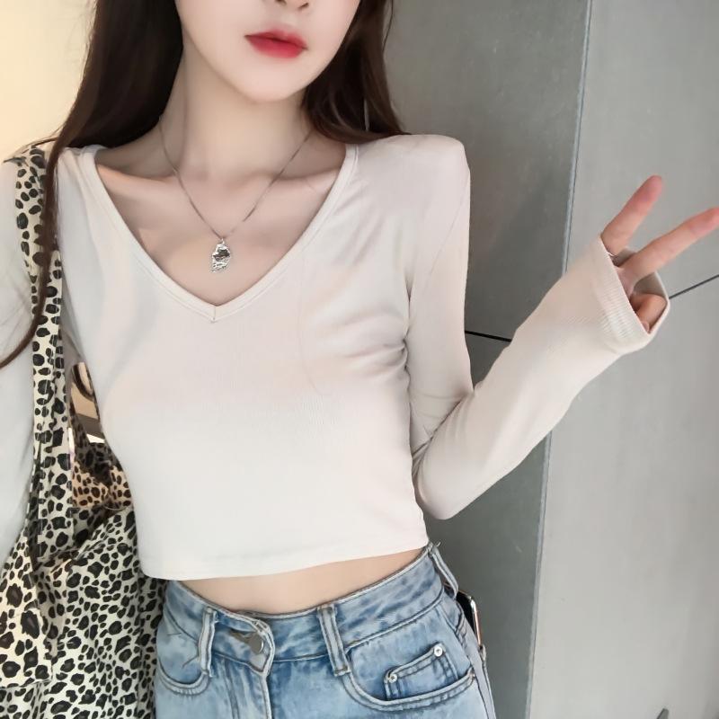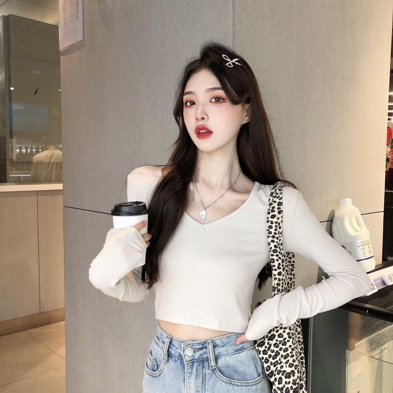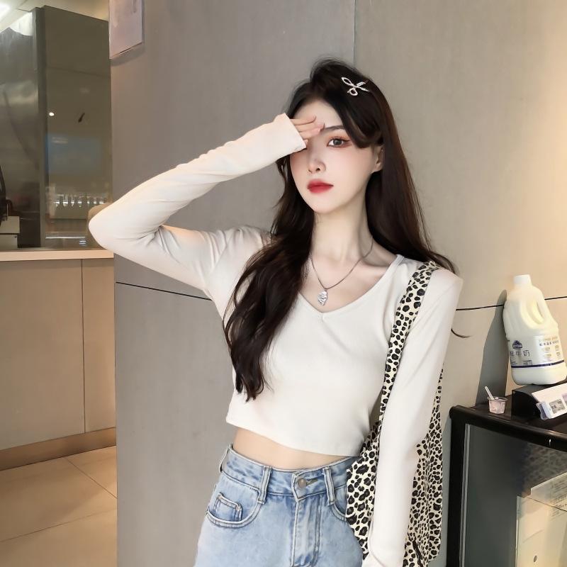 Camiseta Corta Slim de Primavera y Verano con Espalda Descubierta para Mujer, Cuello U Profundo Sexy de Manga Larga, Top de Color Sólido para Mujer, Ropa Coreana para Mujer