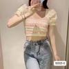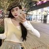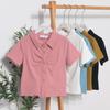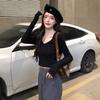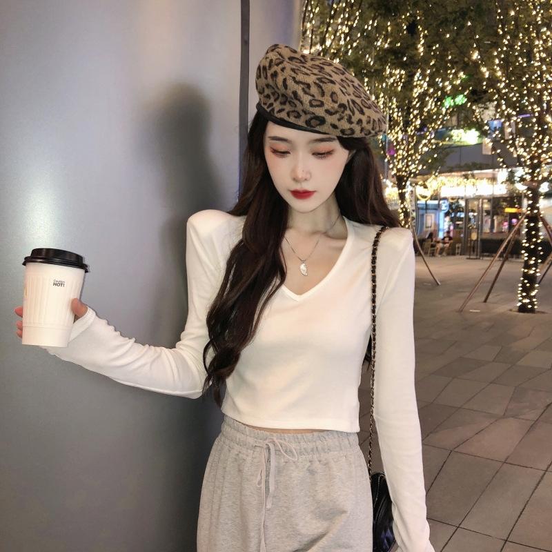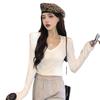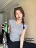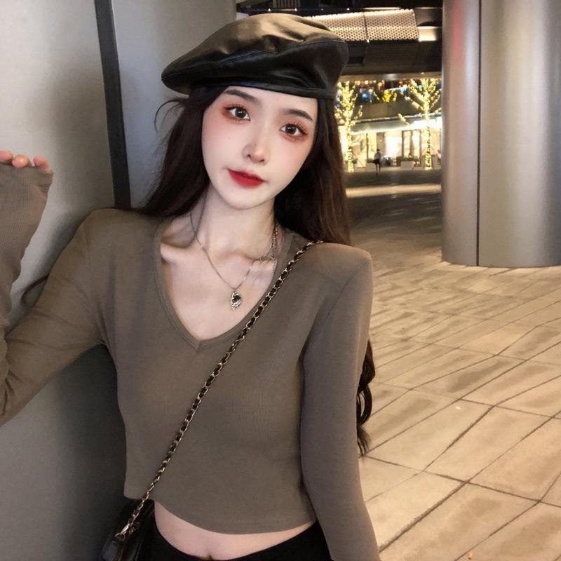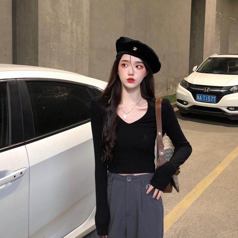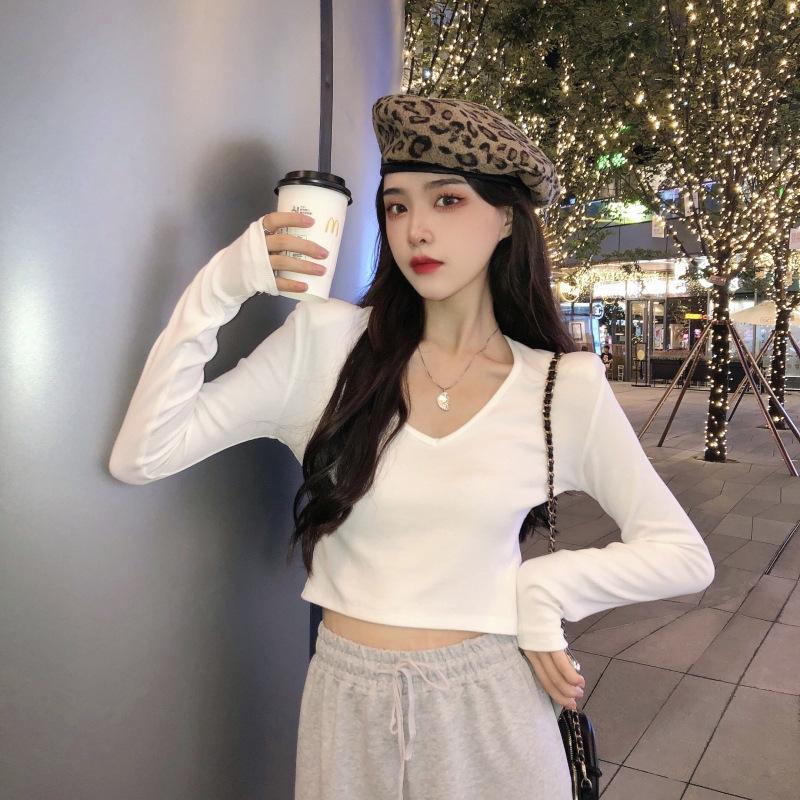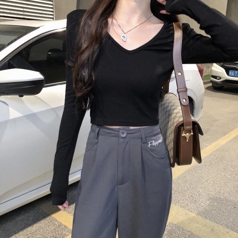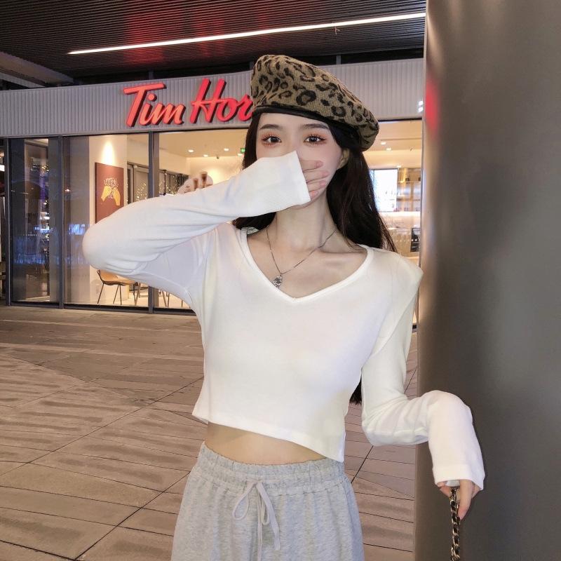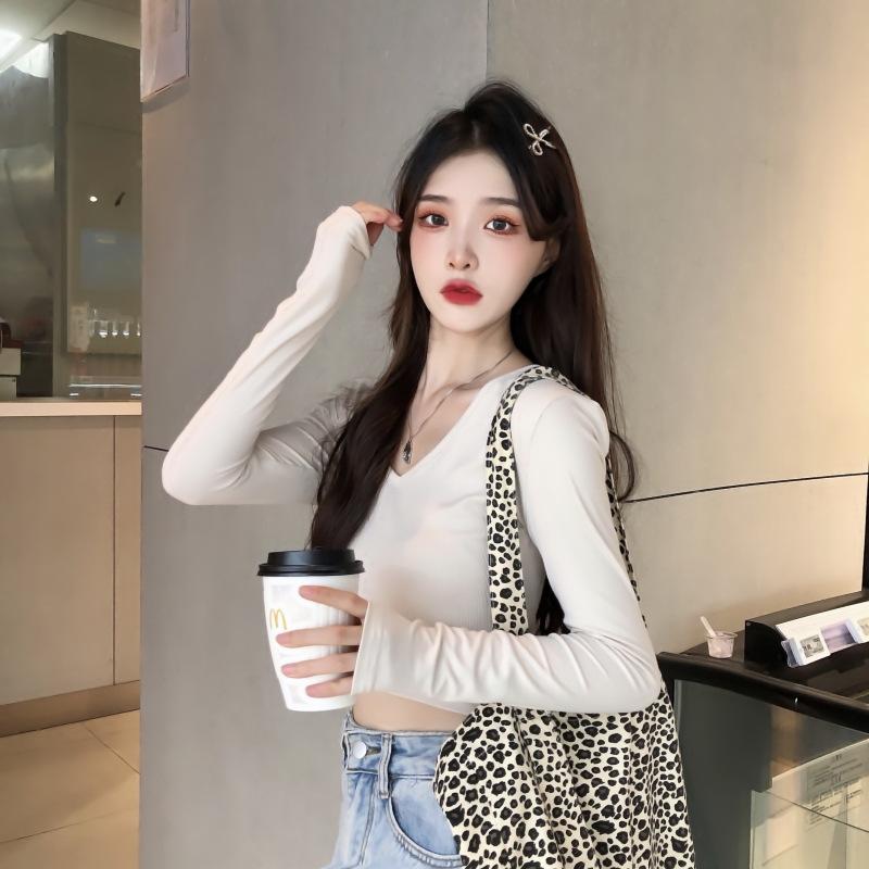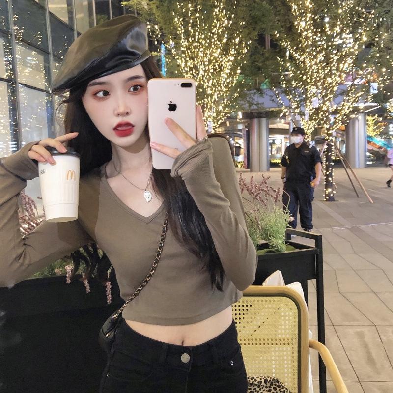 Camiseta Corta Slim de Primavera y Verano con Espalda Descubierta para Mujer, Cuello U Profundo Sexy de Manga Larga, Top de Color Sólido para Mujer, Ropa Coreana para Mujer