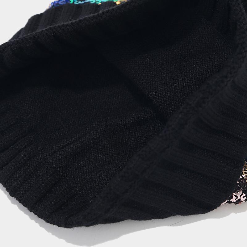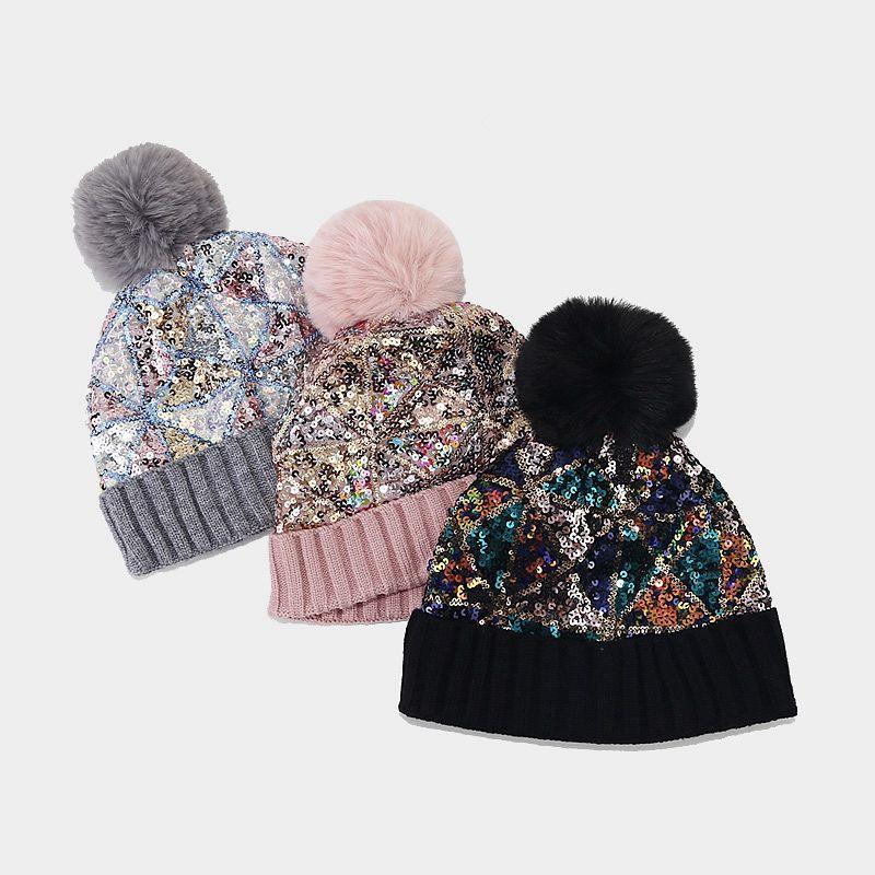 Gorro de punto de lentejuelas de colores de moda europea y americana para mujer Otoño e Invierno Calle versátil engrosado cálido protección para los oídos con bola de pelo gorro frío