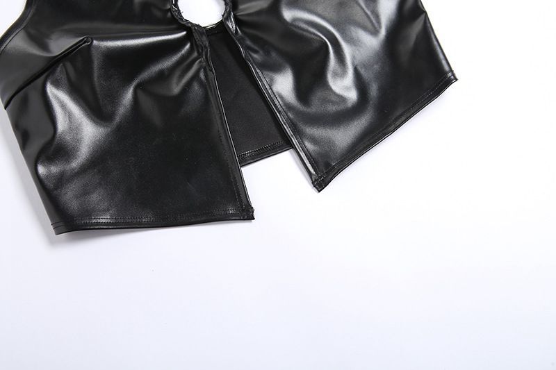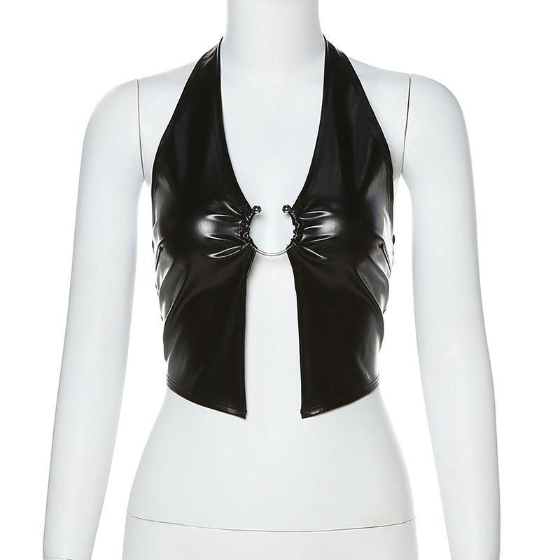 Chaleco pequeño de PU con ombligo descubierto, estilo europeo y americano, novedad de verano de 2023, para mujer, con cuello colgante, sexy, sin espalda, ajustado y con huecos.