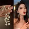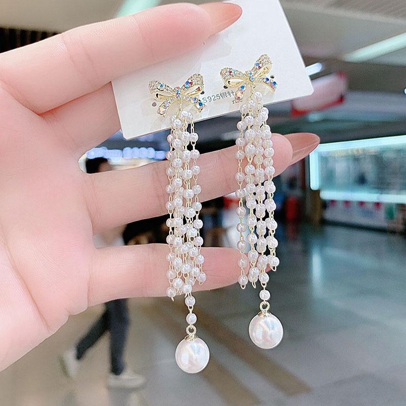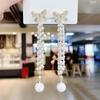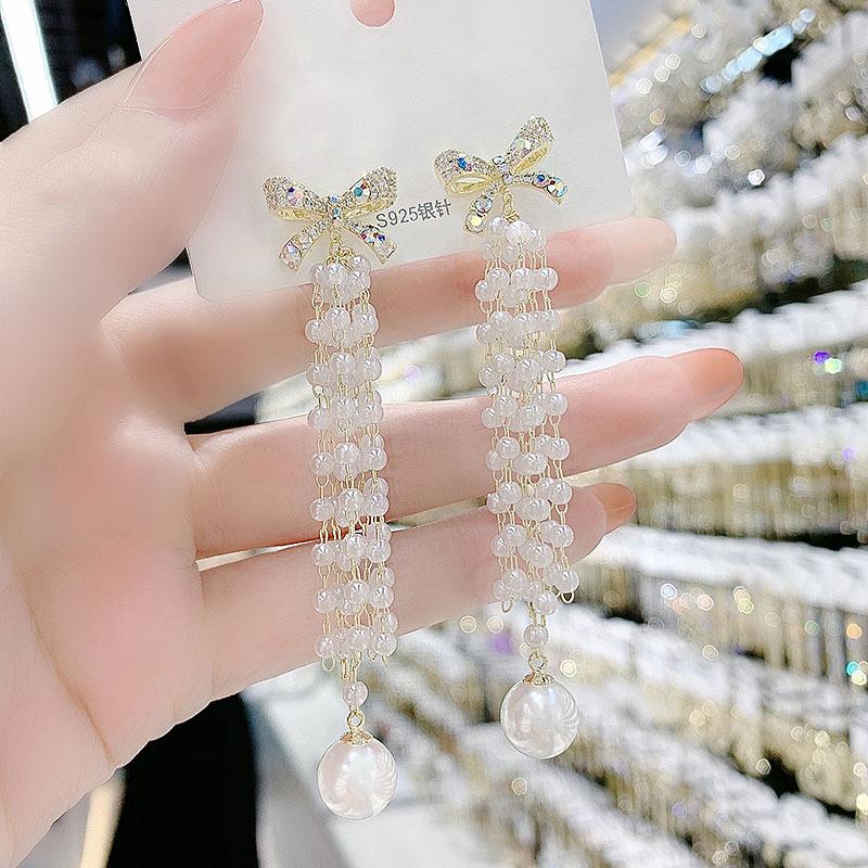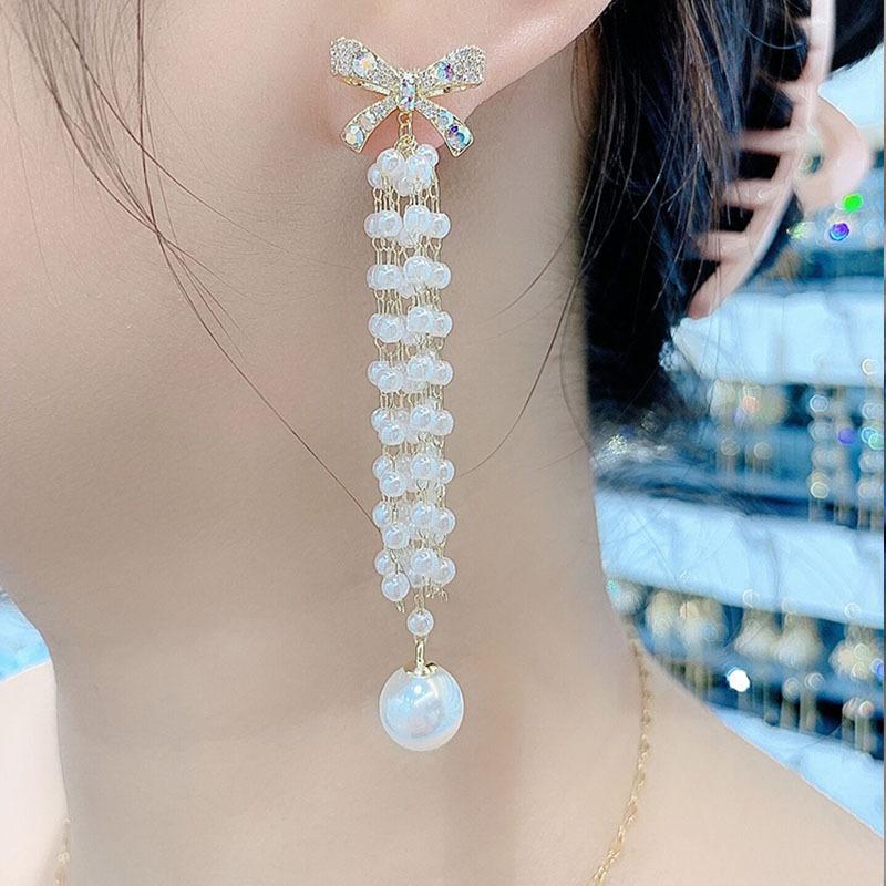 Pendientes de borla con lazo de cristal y aguja de plata S925, pendientes largos de perlas elegantes de celebridades de Internet, pendientes para mujer