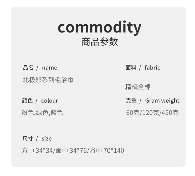 Square towel 34*34 -50g, Face towel 34*76 -120g, Bath towel 70*140- 450g