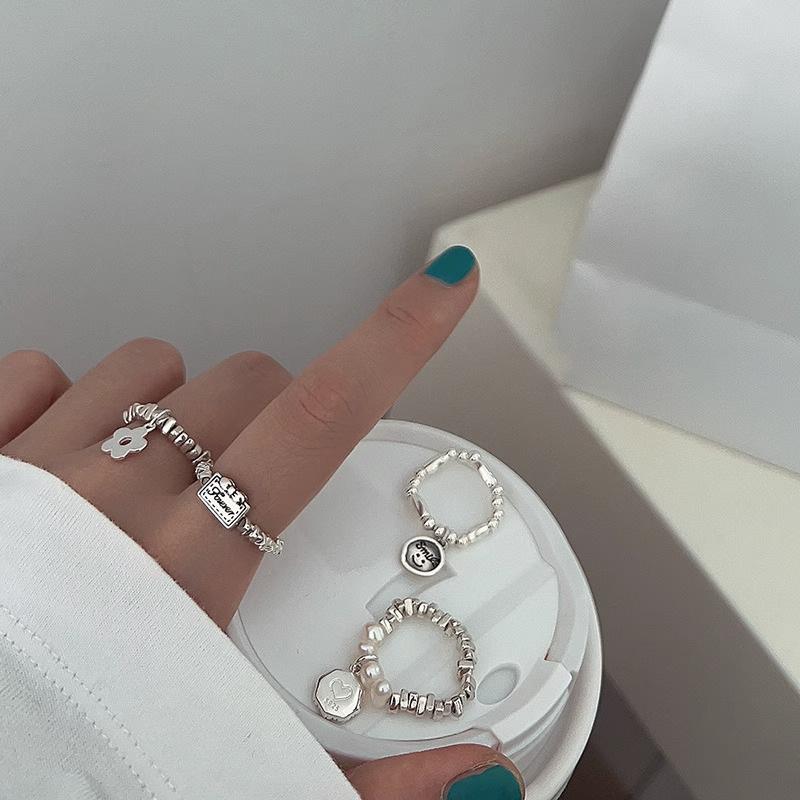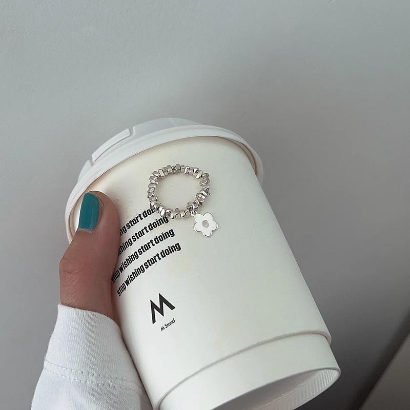 Anillo de plata de ley 925 con diseño de flor pequeña y amor, hecho a mano, con diseño de comida apilada, para mujer