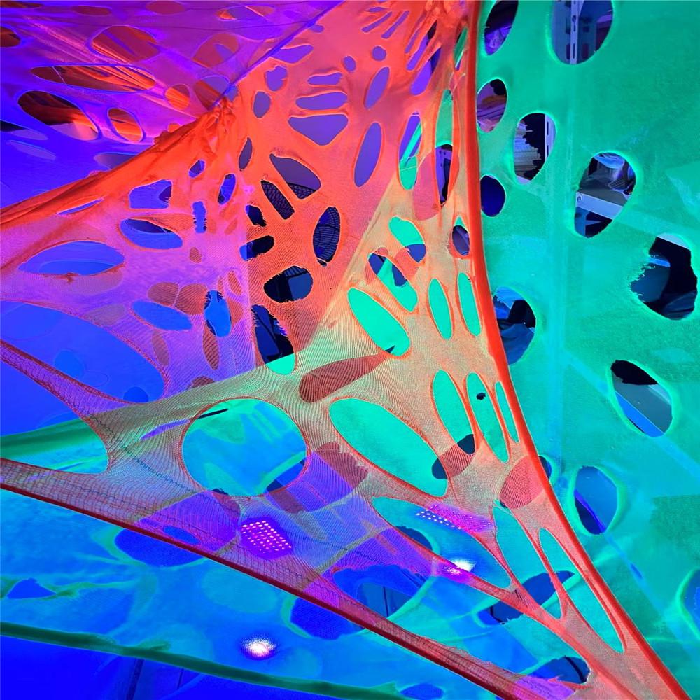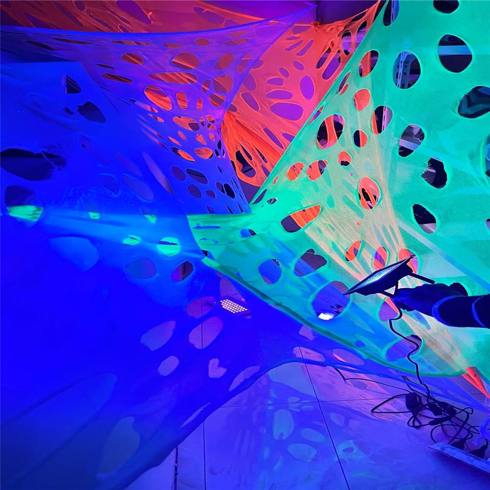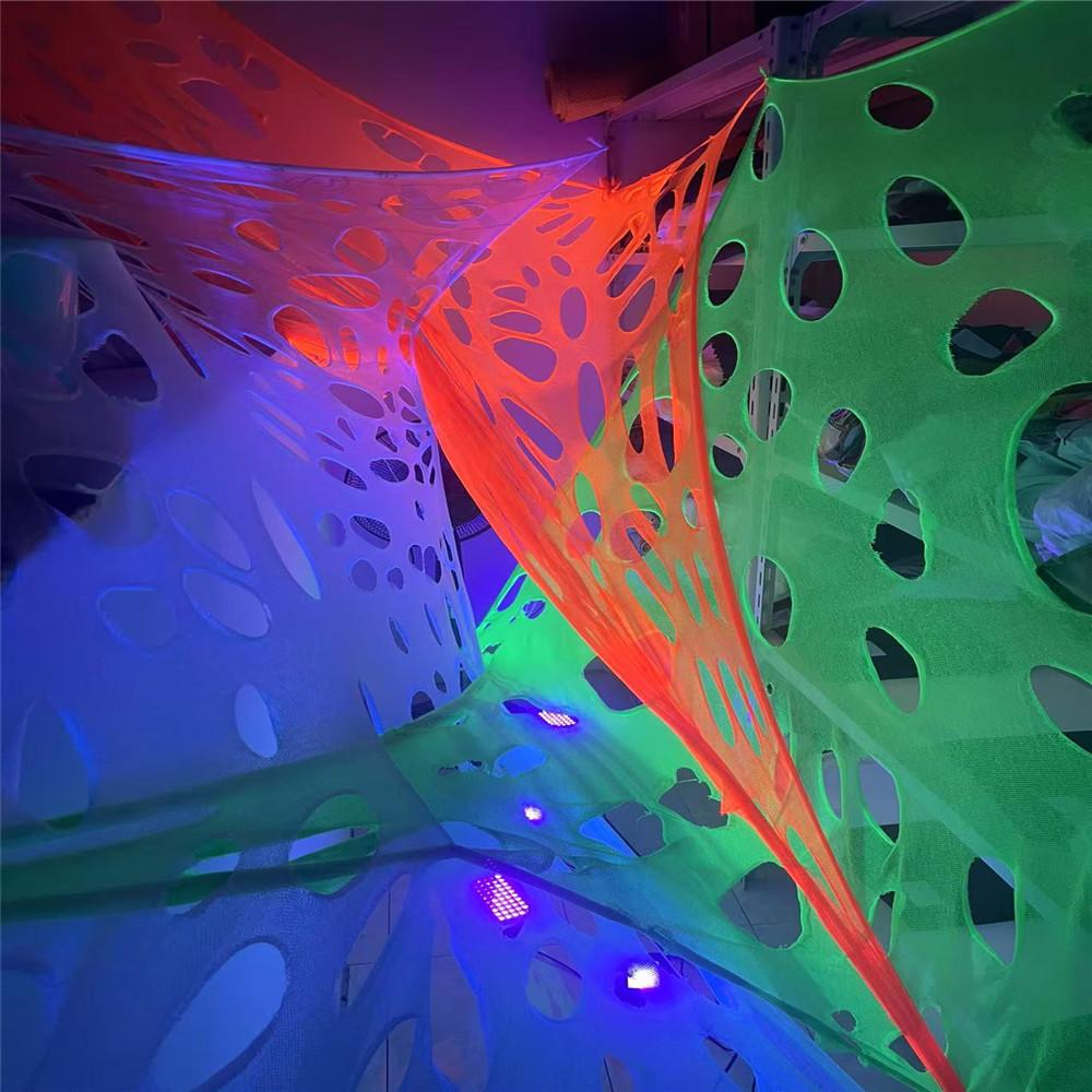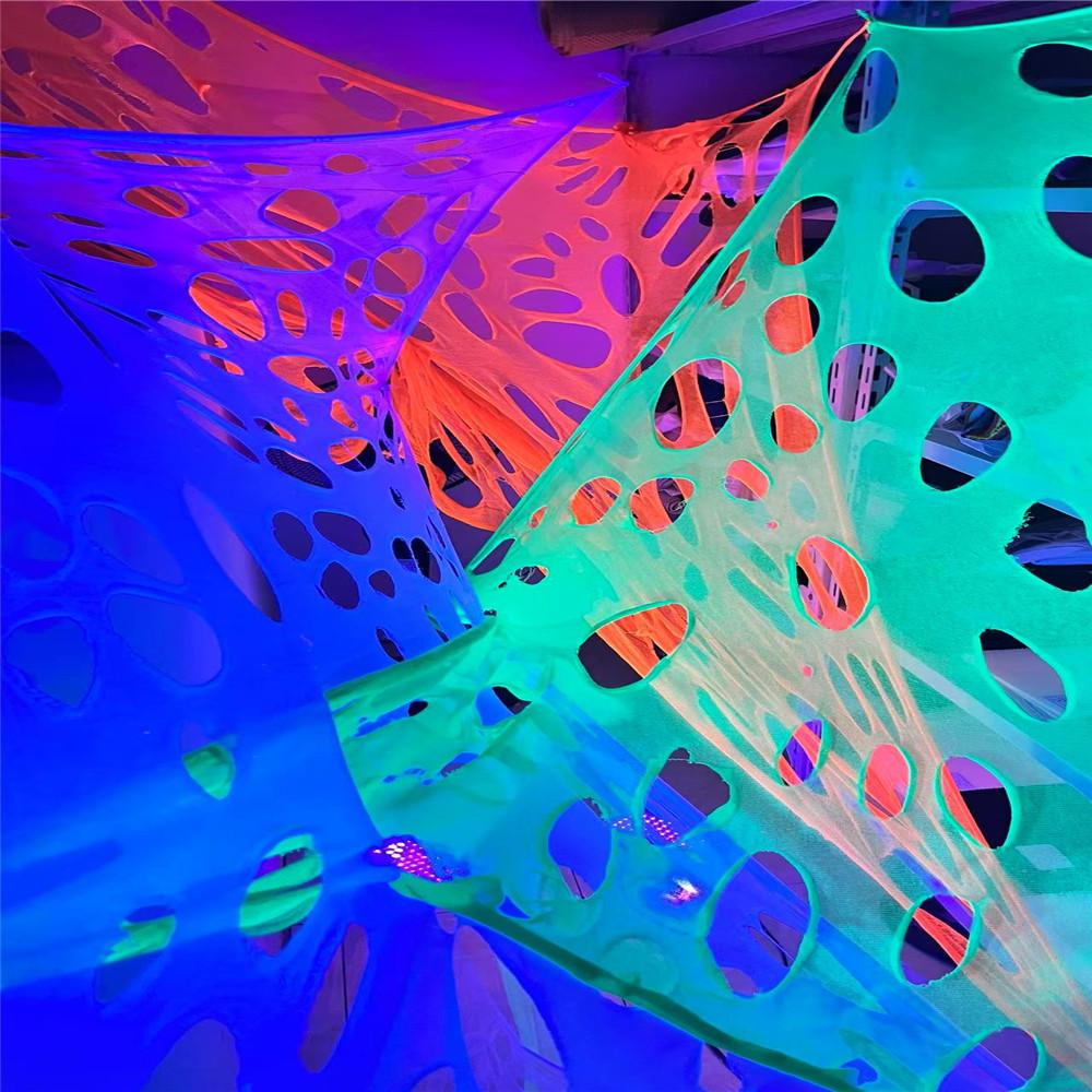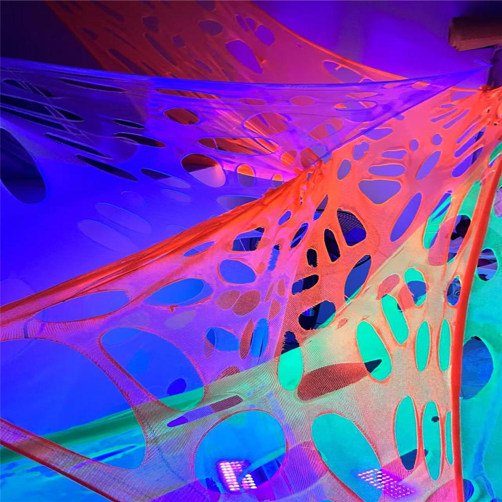 • Material plástico: Algunas telarañas fluorescentes hechas de plástico tienen buena flexibilidad y elasticidad, y son impermeables y a prueba de humedad, lo que las hace adecuadas para su uso en entornos al aire libre.