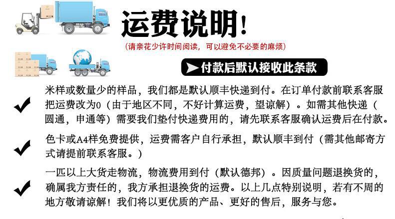 2. Nuestra empresa se encuentra enNo se ofrece envío gratuito durante períodos no promocionales.Estimado, si tiene algún requisito de entrega urgente, comuníquese con el servicio de atención al cliente.Por defecto, las muestras se enviarán a Shunfeng Collect. Para lotes pequeños, se enviarán a SF Express y STO. Si se trata de grandes cantidades, se enviarán a la logística designada.. (Si SF Express no está disponible, tenga en cuenta otra entrega exprés o EMS. Se enviará dentro de las 72 horas posteriores al pago. El envío se marcará alrededor de las 9 en punto todas las noches. No se apresure. Comuníquese con el servicio al cliente con anticipación para pedidos urgentes.