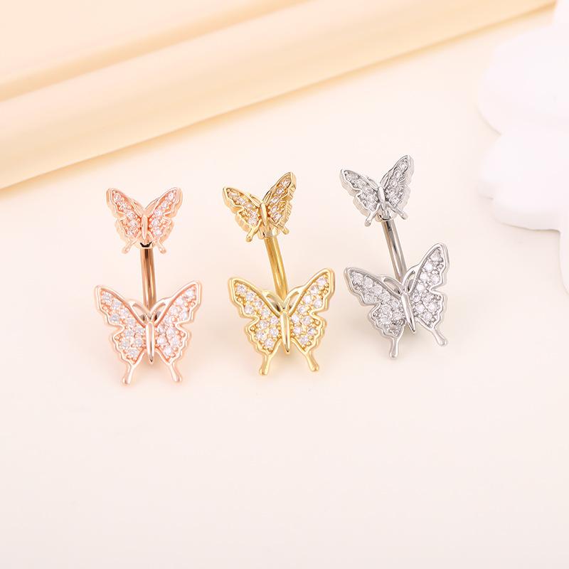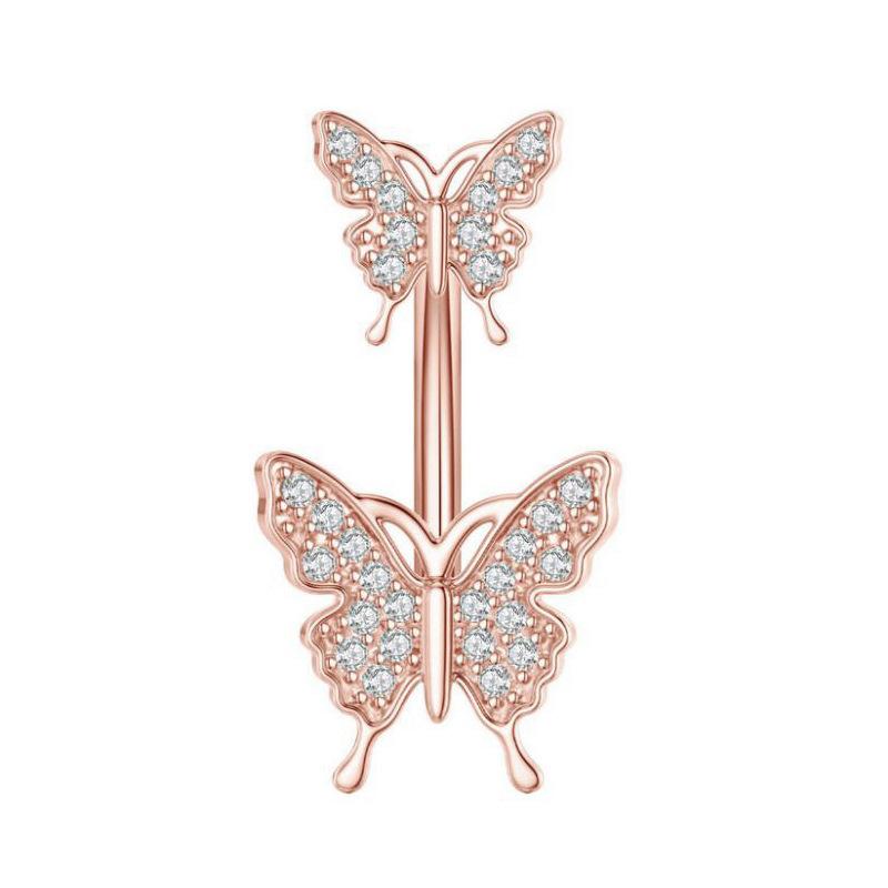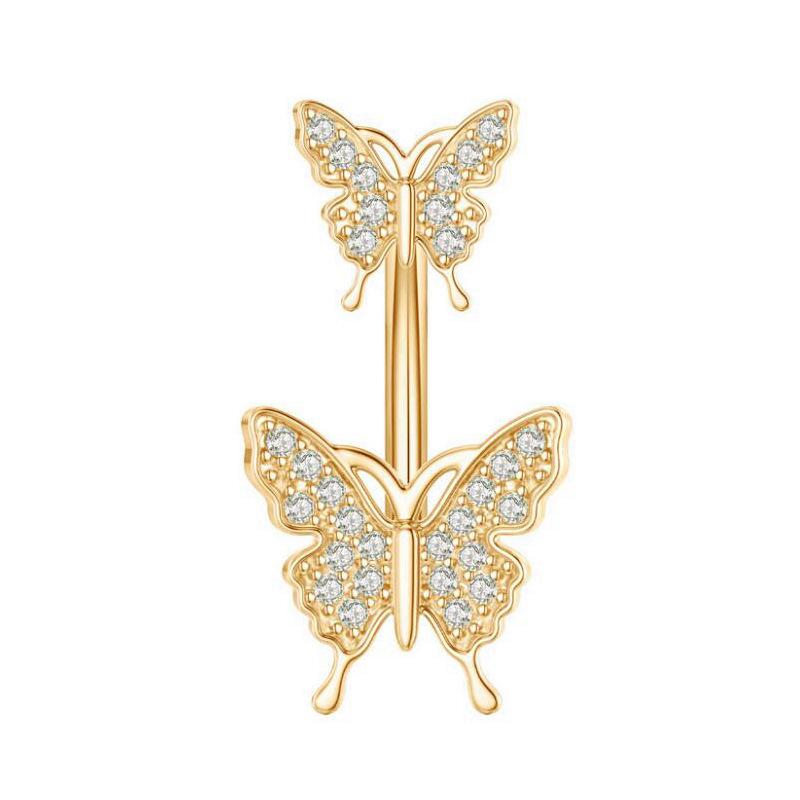 Exquisito anillo de ombligo de acero inoxidable 316 con doble mariposa de circonita y clavo europeo y americano, joyería para piercing corporal muy vendida en Amazon