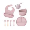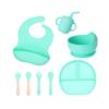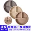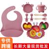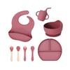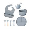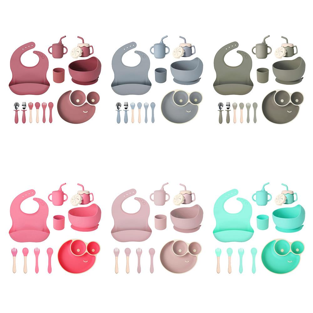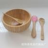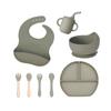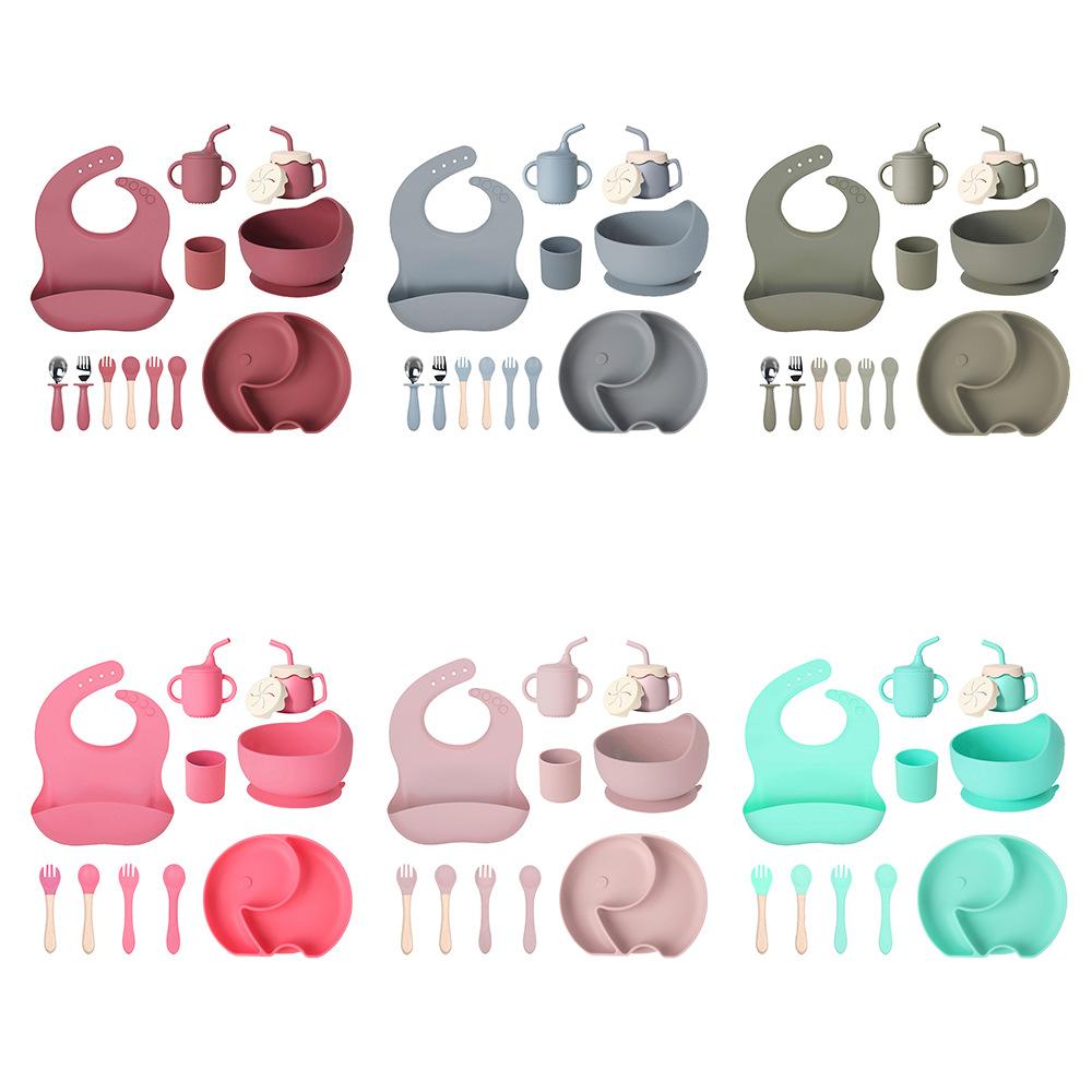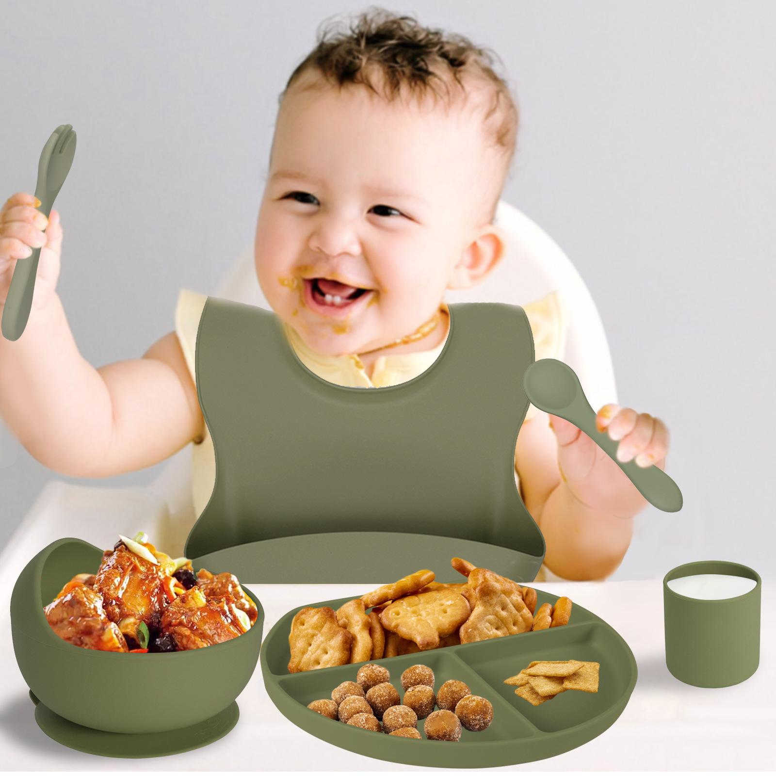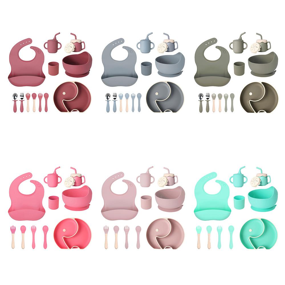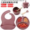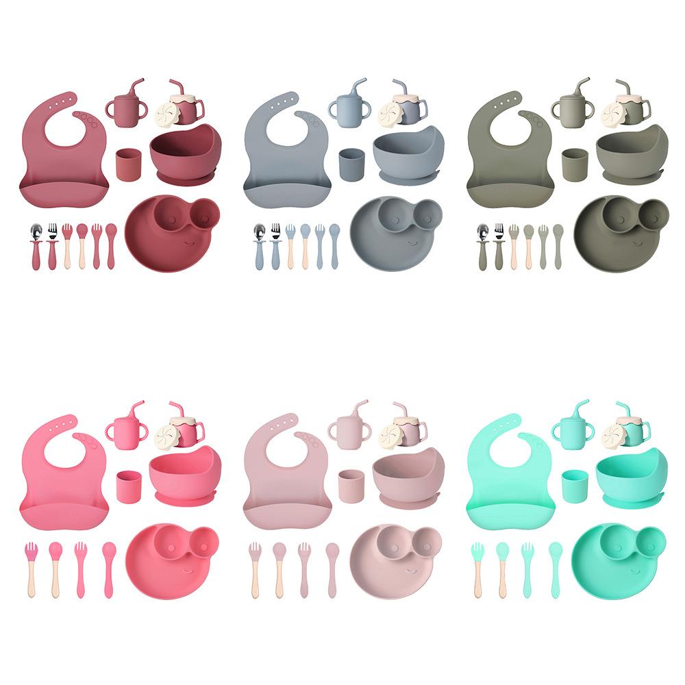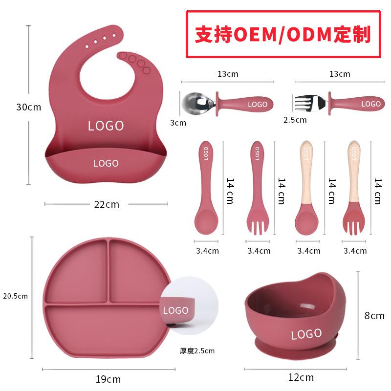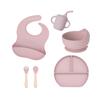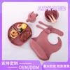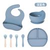 Juego de vajilla de silicona para bebé de 6 piezas, cuenco de silicona para niños, plato con ventosa, taza de agua, mango de madera, tenedor, cuchara, vajilla confeccionada al por mayor.