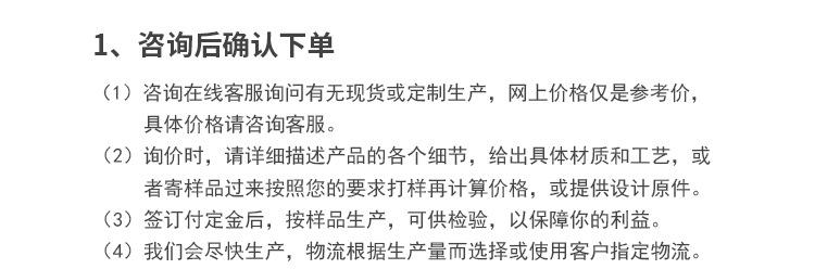(1) Por favor, revise cuidadosamente la tabla de tallas y la descripción del producto antes de realizar su pedido. Consulte con atención al cliente para conocer las especificaciones requeridas antes de realizar su pedido. Por favor, informe al personal de atención al cliente sobre el estilo, la cantidad, las especificaciones, la categoría del material, el proceso de producción, etc. del producto para que podamos ofrecerle un presupuesto preciso. Además, dado que el inventario puede cambiar en cualquier momento, contáctenos antes de comprar y confirme si la talla que necesita está disponible. La producción comenzará según el borrador de confirmación del comprador y no se aceptarán modificaciones por parte del cliente. El plazo de entrega también varía según la cantidad y la fabricación.