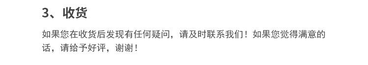 (4) Cuando el comprador reciba la mercancía y el repartidor esté presente, compruebe que la mercancía del paquete esté intacta antes de firmar. Firmar significa que la mercancía está en buen estado. Si encuentra algún daño en el paquete, infórmeselo al repartidor a tiempo. No nos hacemos responsables de ningún problema que pueda surgir después de la recepción. Gracias por su cooperación.