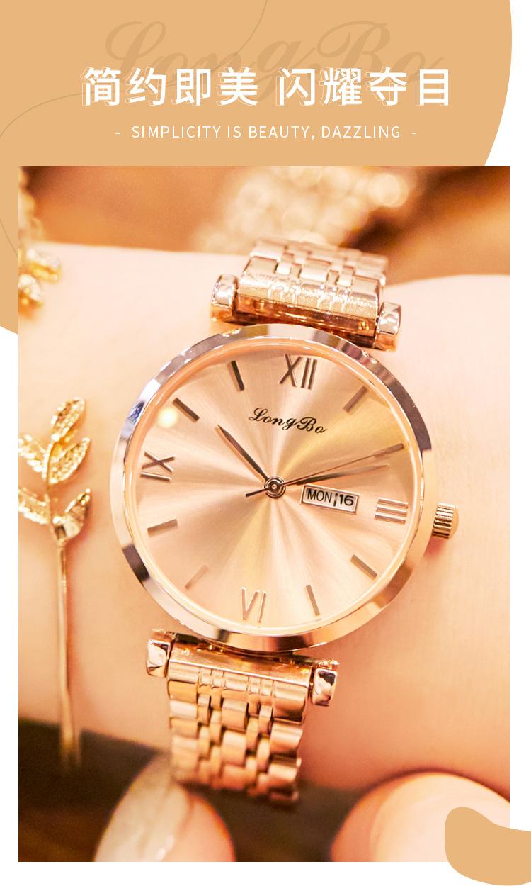 LONGBO LONGBO Nuevo reloj para mujer, reloj de cuarzo coreano, informal, sencillo, doble calendario, correa de acero sólido de tres pines, venta al por mayor