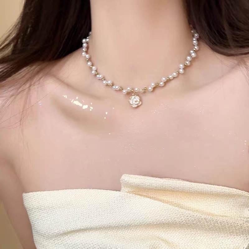 Cadena de Clavícula de Perla Camelia Francesa para Mujer, Nuevo Accesorio de Moda Verano 2025, Collar de Lujo Ligero y de Alta Gama