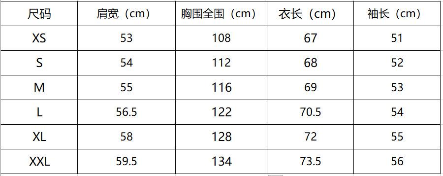 XS, S, M, L, XL, XXL
