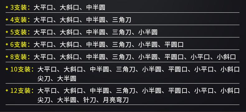 Paquete de 10: boca plana grande, boca oblicua grande, semicírculo mediano, cuchillo triangular, semicírculo pequeño, boca redonda plana, boca plana pequeña, boca oblicua pequeña, cuchillo afilado, semicírculo grande