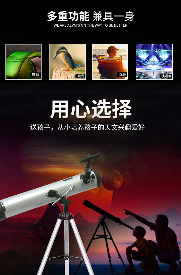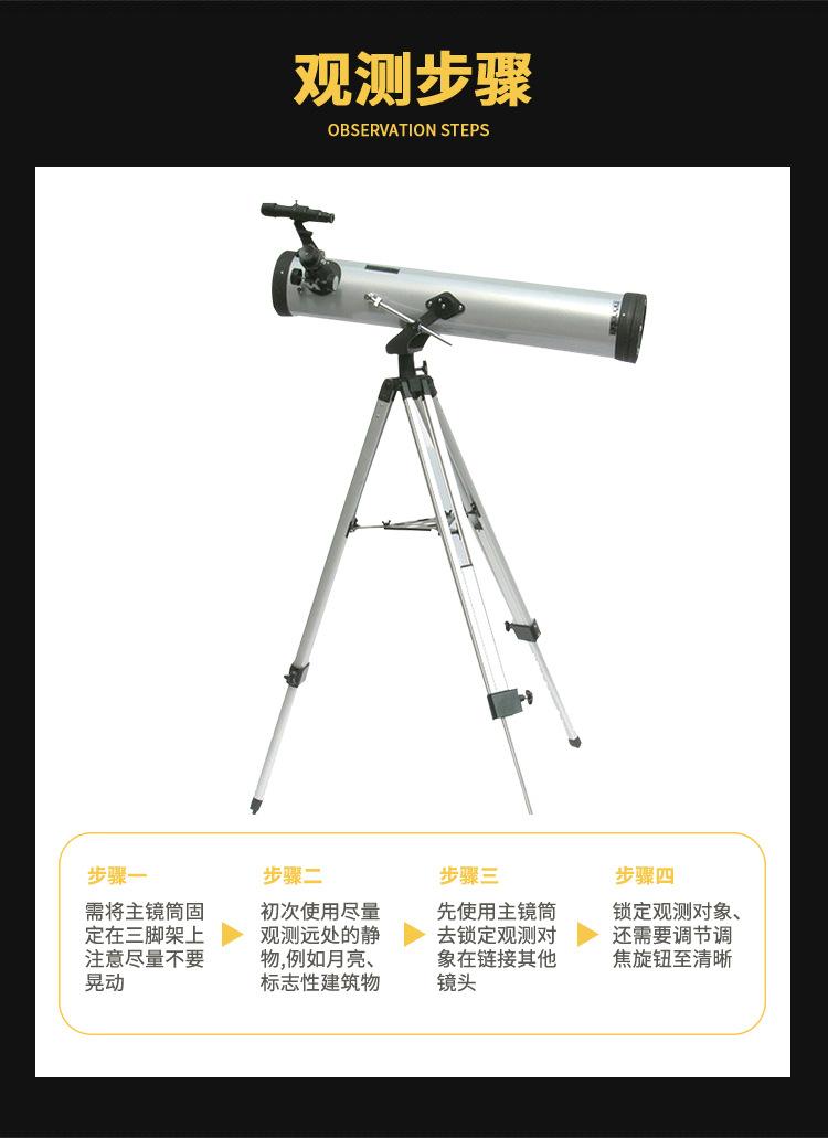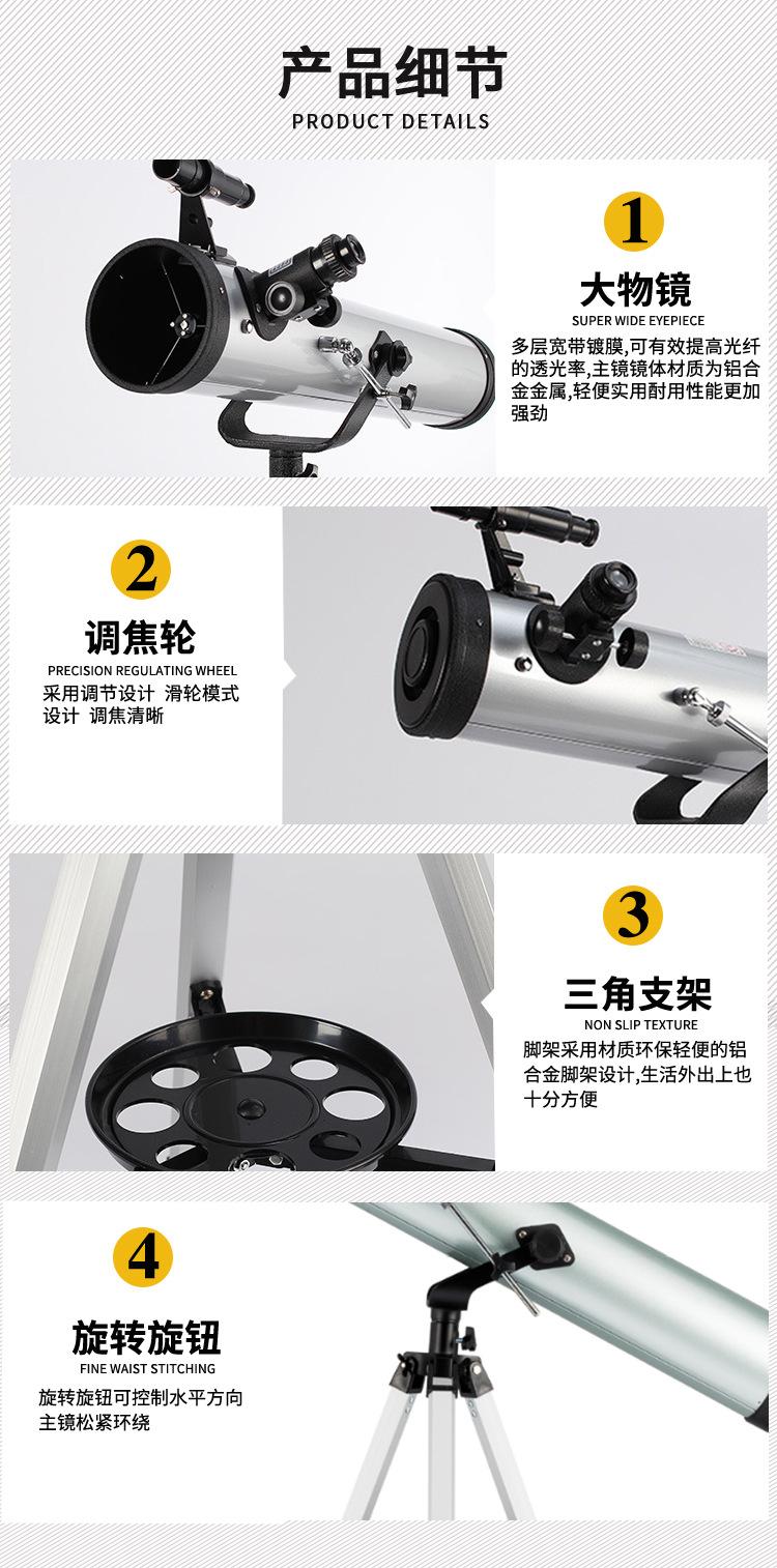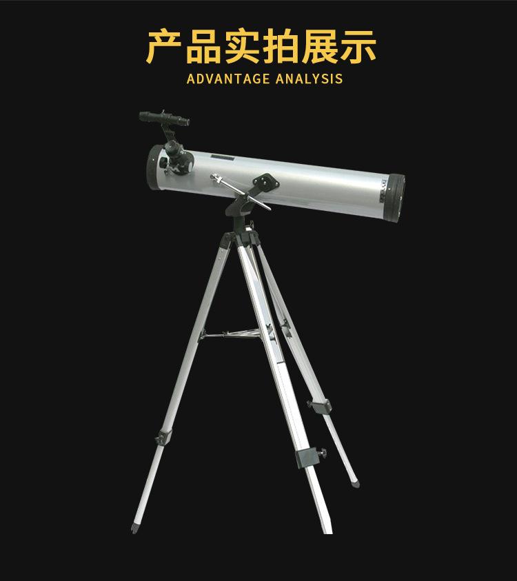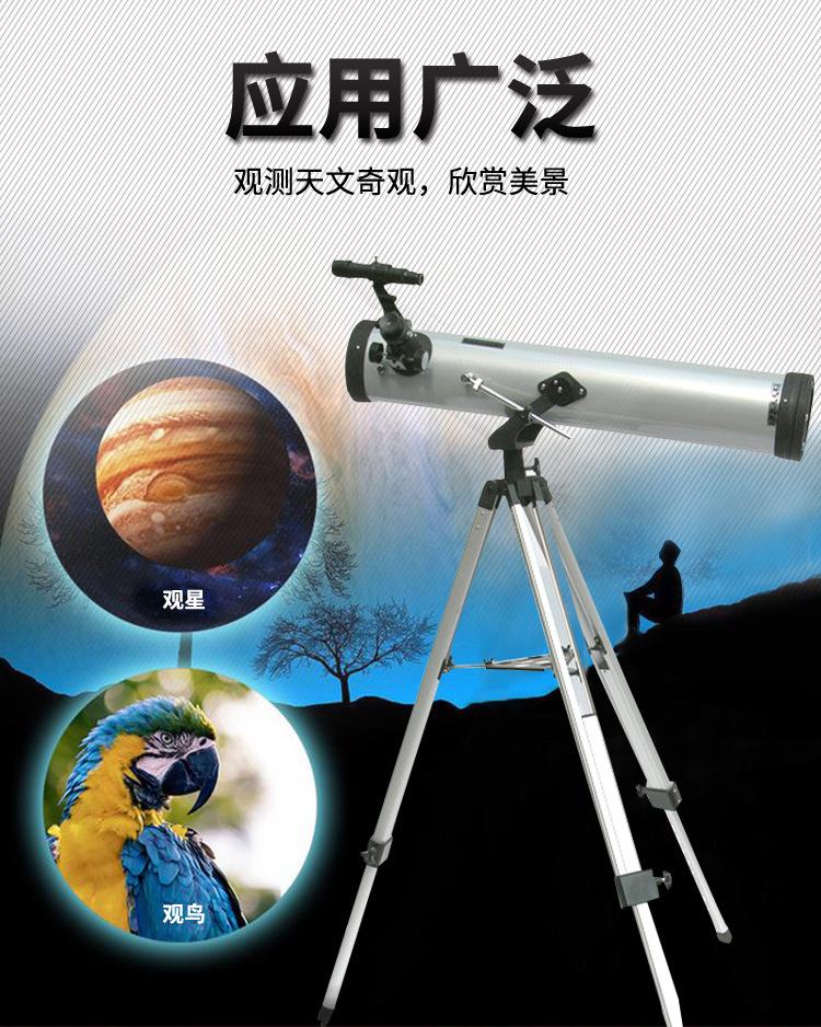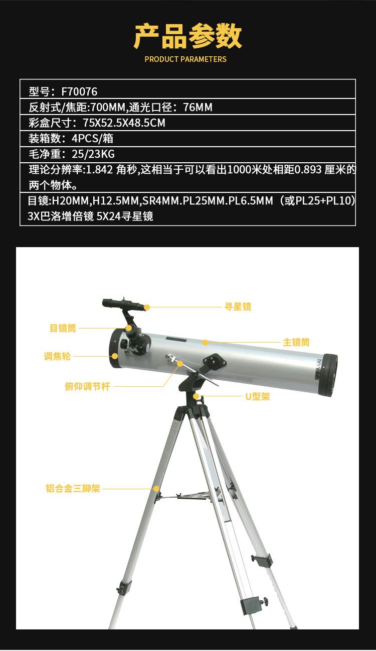F70076 es un telescopio astronómico reflectivo mejorado con buen rendimiento en la observación de cuerpos celestes. Tiene un precio moderado y es adecuado para entusiastas de la astronomía de nivel básico. Está equipado con 3 oculares de diferentes aumentos y un amplificador 2X..Le permite emparejar y observar libremente objetos de diferentes distancias y tamaños. El buscador 5x puede ayudarle a encontrar el objetivo rápidamente.