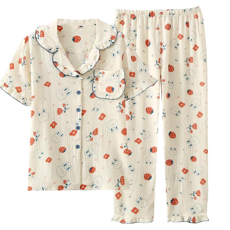 Pijama para Mujer Algodón Puro Dulce Conejo Verano Primavera y Otoño Delgado Manga Corta Pantalón Traje Suelto Ropa de Casa Transpirable Absorción de Sudor