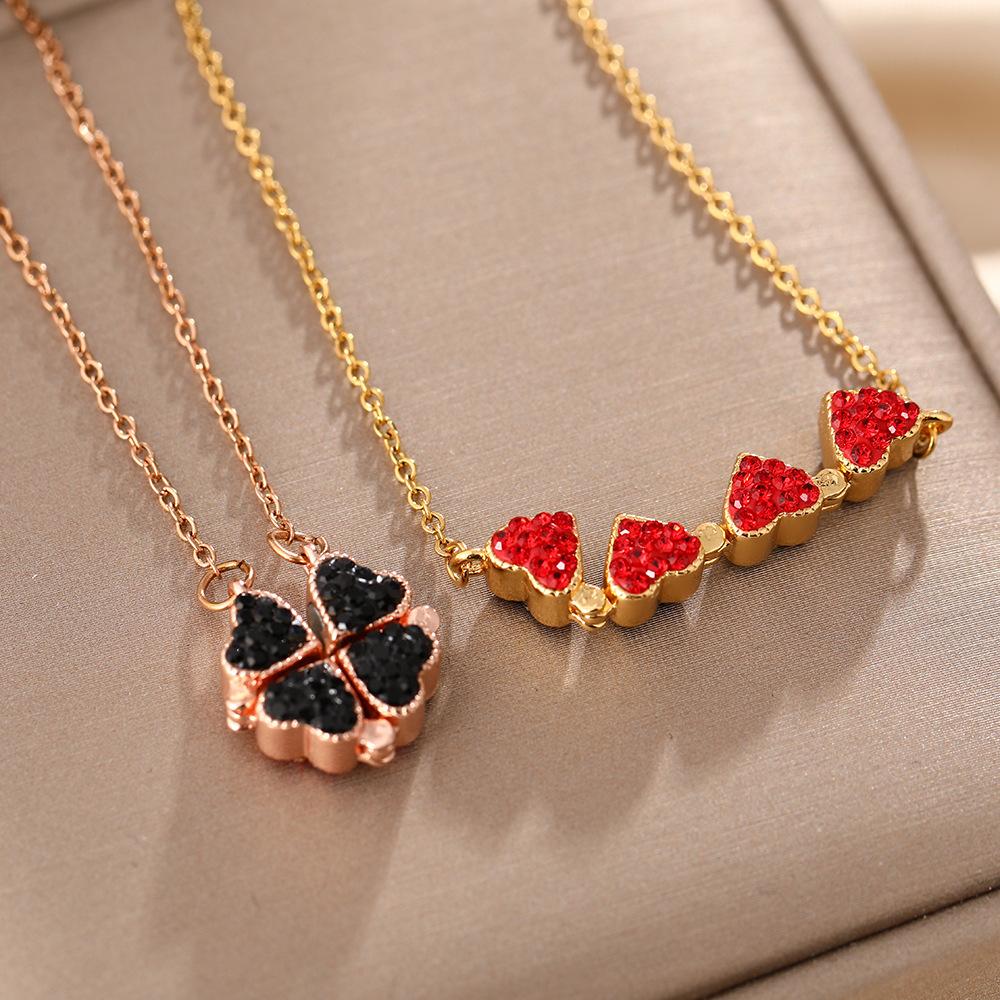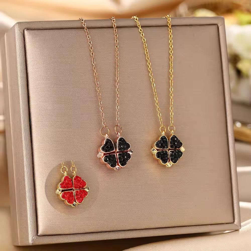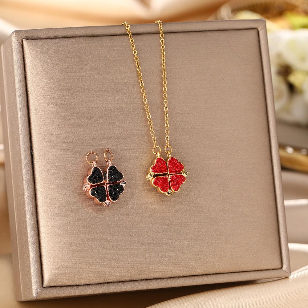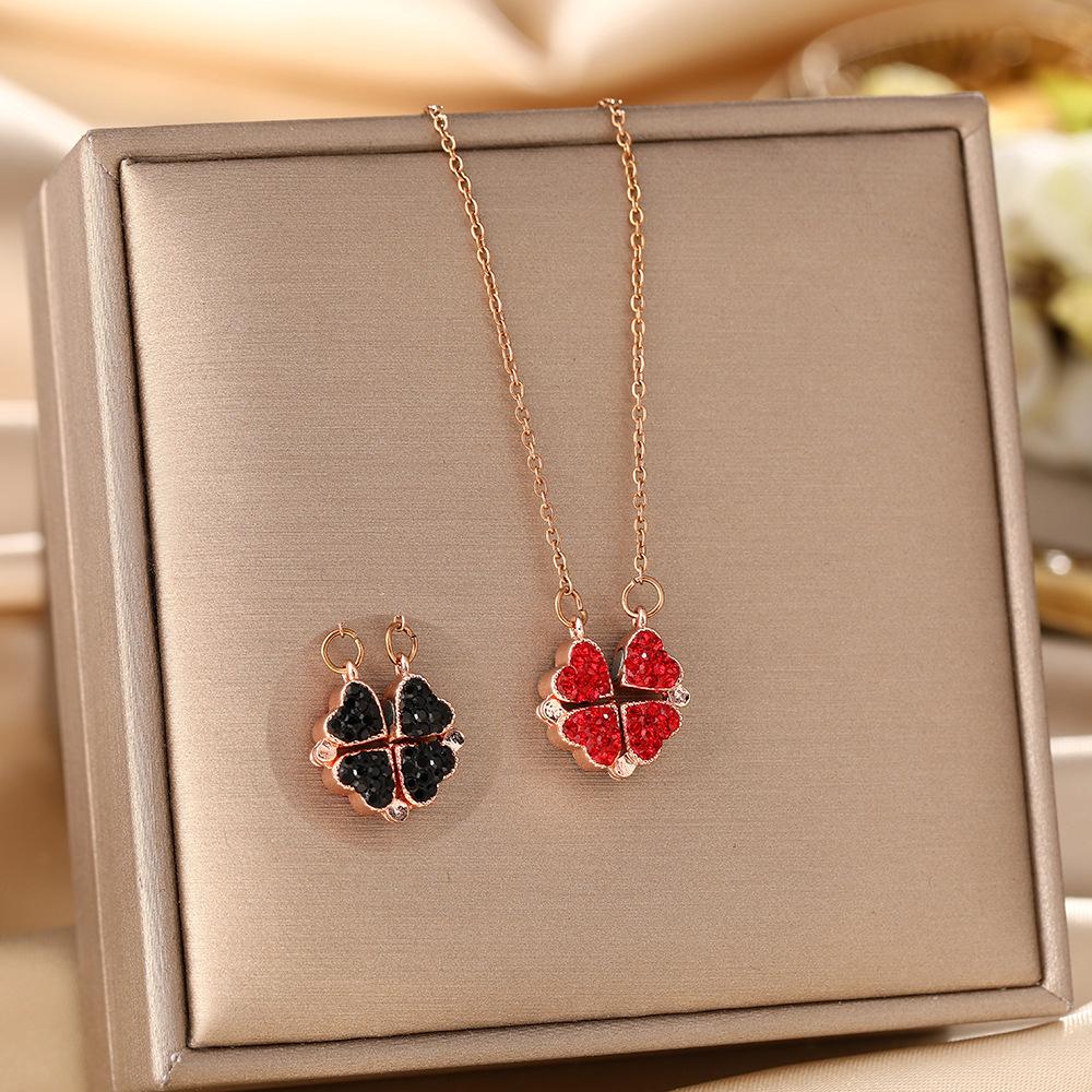 Collar de acero de titanio con diseño de trébol de cuatro hojas estilo coreano para mujer, colgante de dos piezas en negro y rojo, cadena de clavícula de alta calidad.