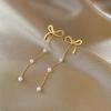 Pendientes de perlas con lazo y borlas de aguja plateada para mujer, pendientes largos de temperamento dulce coreano, joyería versátil y de moda para las orejas.