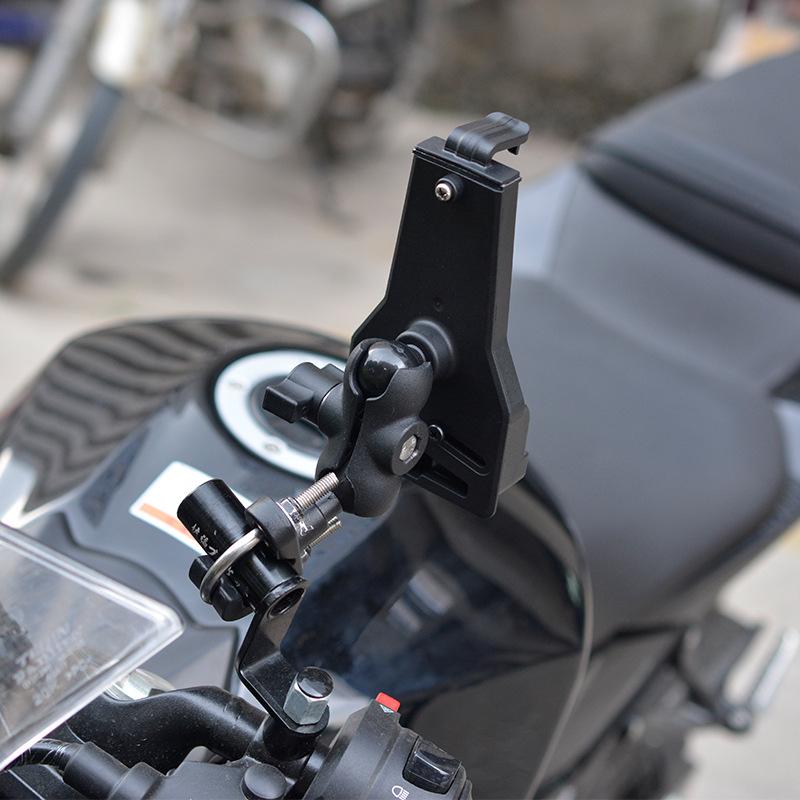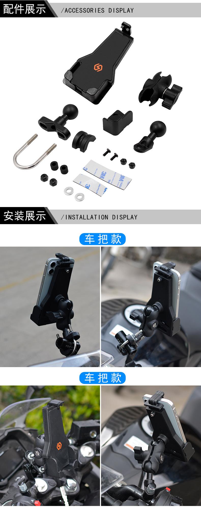 [Los productos incluyen]: cuerpo del soporte*1, soporte en U de acero inoxidable*1, accesorio en T de montaje en manillar*1, almohadilla antiarañazos*1, tapa de goma negra*2, tuerca negra*4, arandela metálica*2, pieza de almohadilla 3M*2, tornillo negro*2, soporte de fijación para espejo retrovisor*1, biela*1, pie de fijación inferior*2