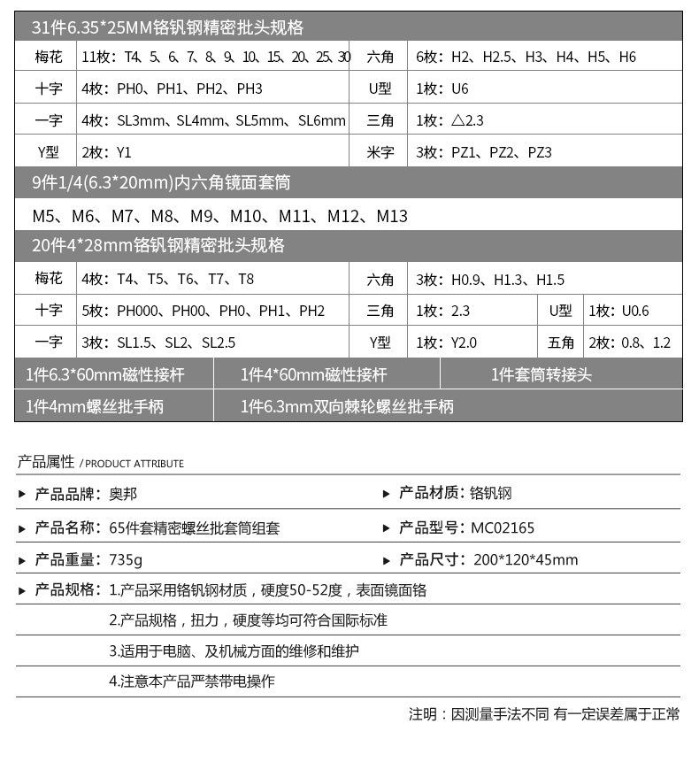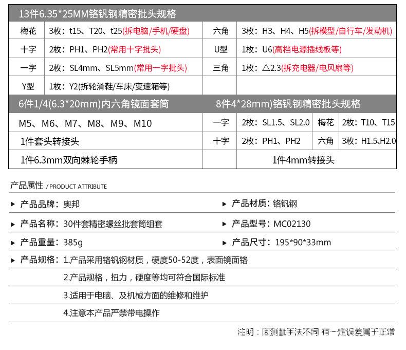 30PCs screwdriver socket set (10 sets/Box, 40 sets/piece, 0.5kg/set) * T9, 65PCs screwdriver sleeve set (6 set...