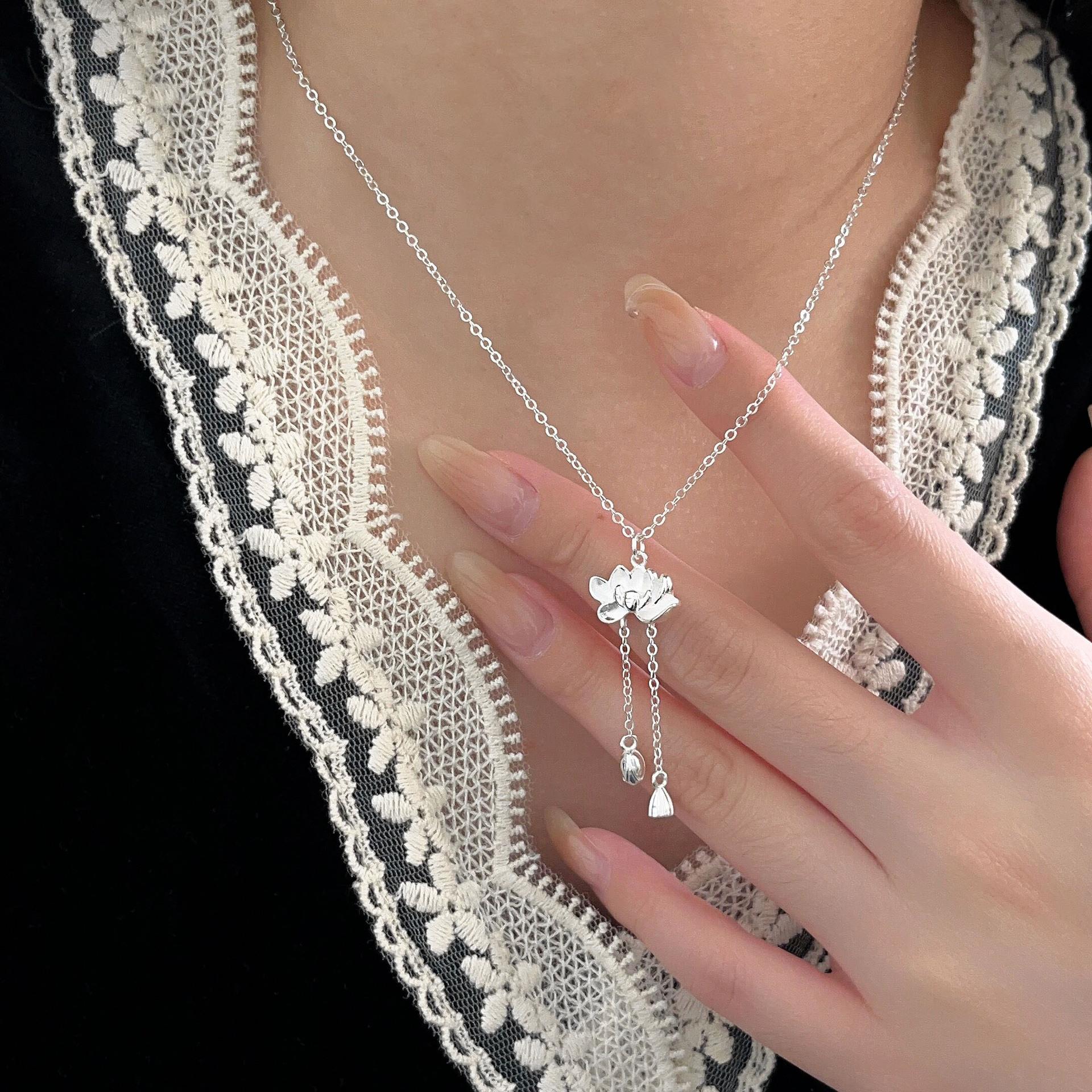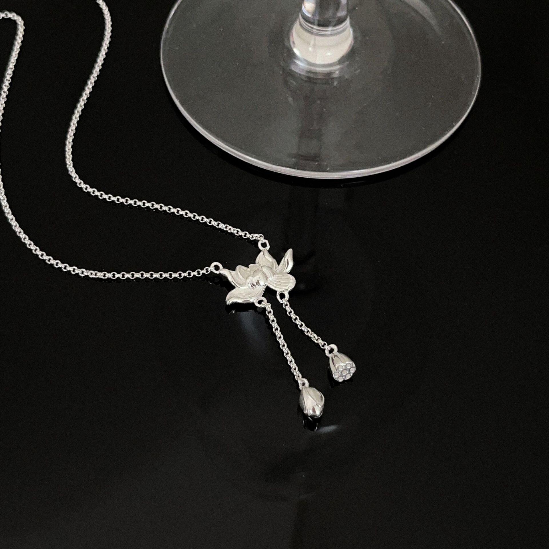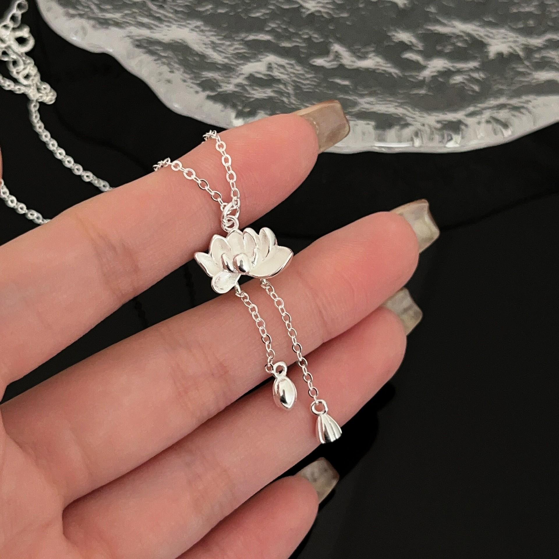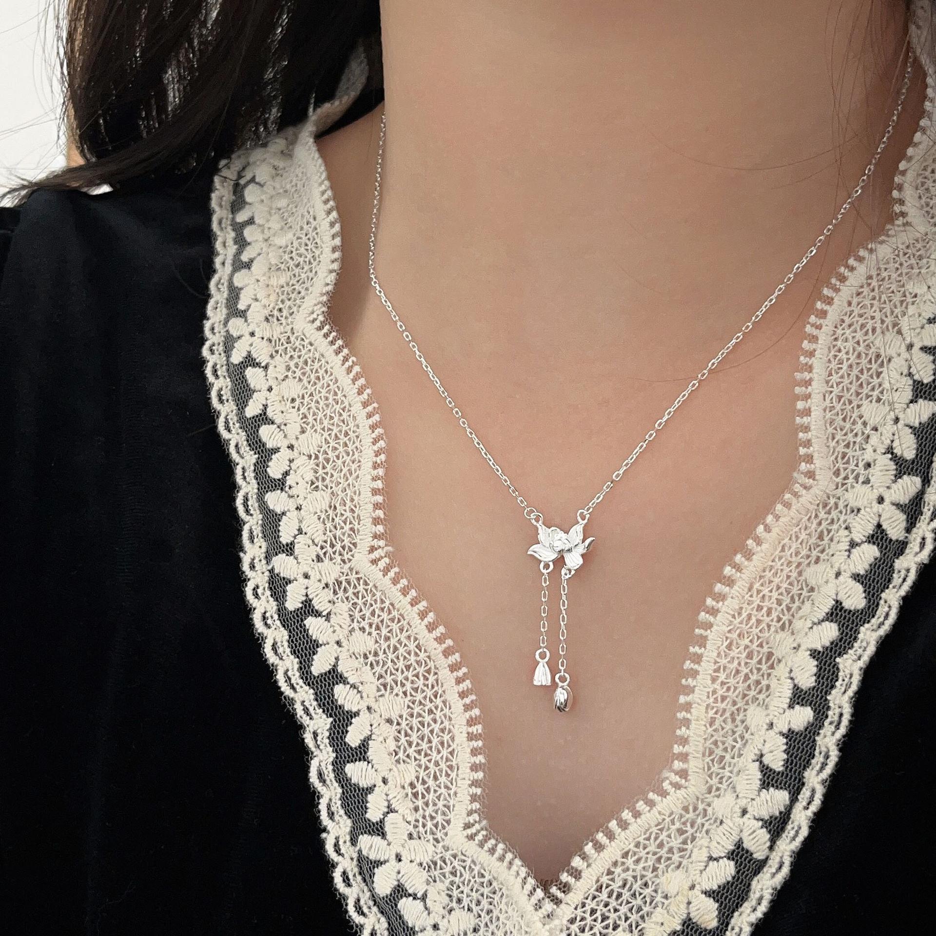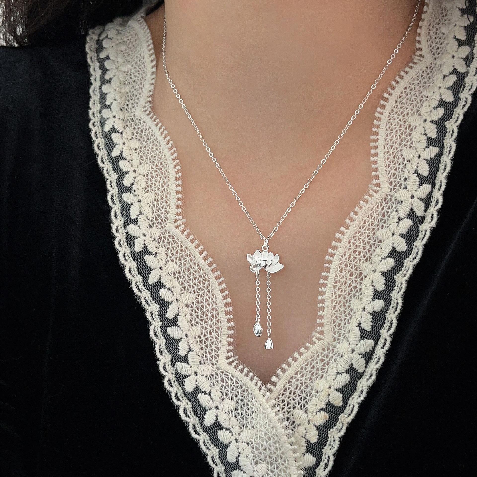Collar de plata de ley s925 Ruitai con cadena de clavícula de loto de dos mundos, estilo étnico, colección de moda nacional, collar de plata lisa para mujer