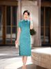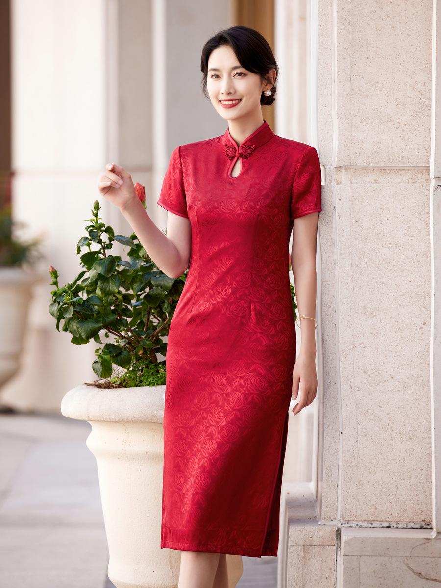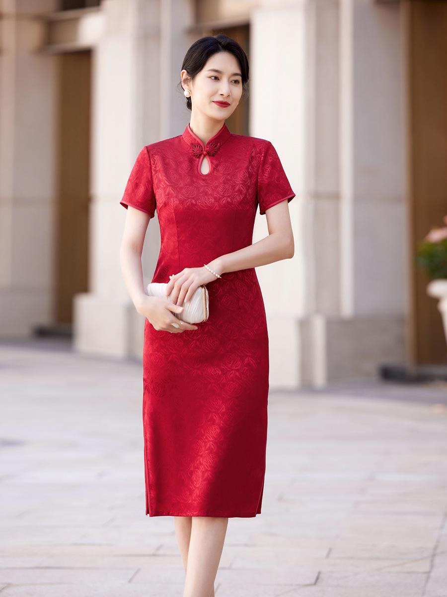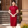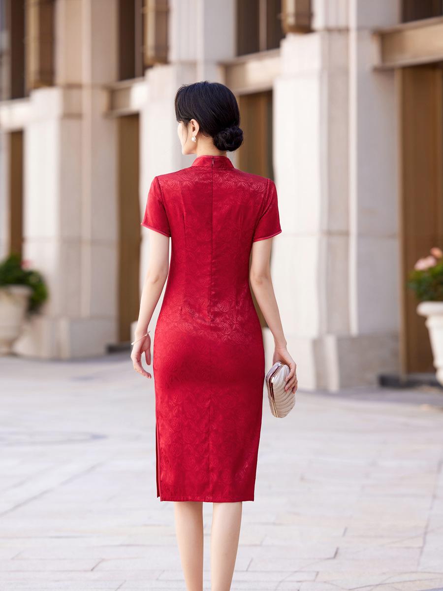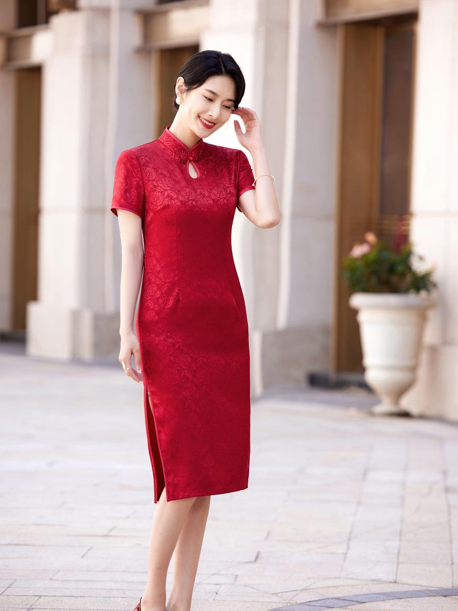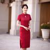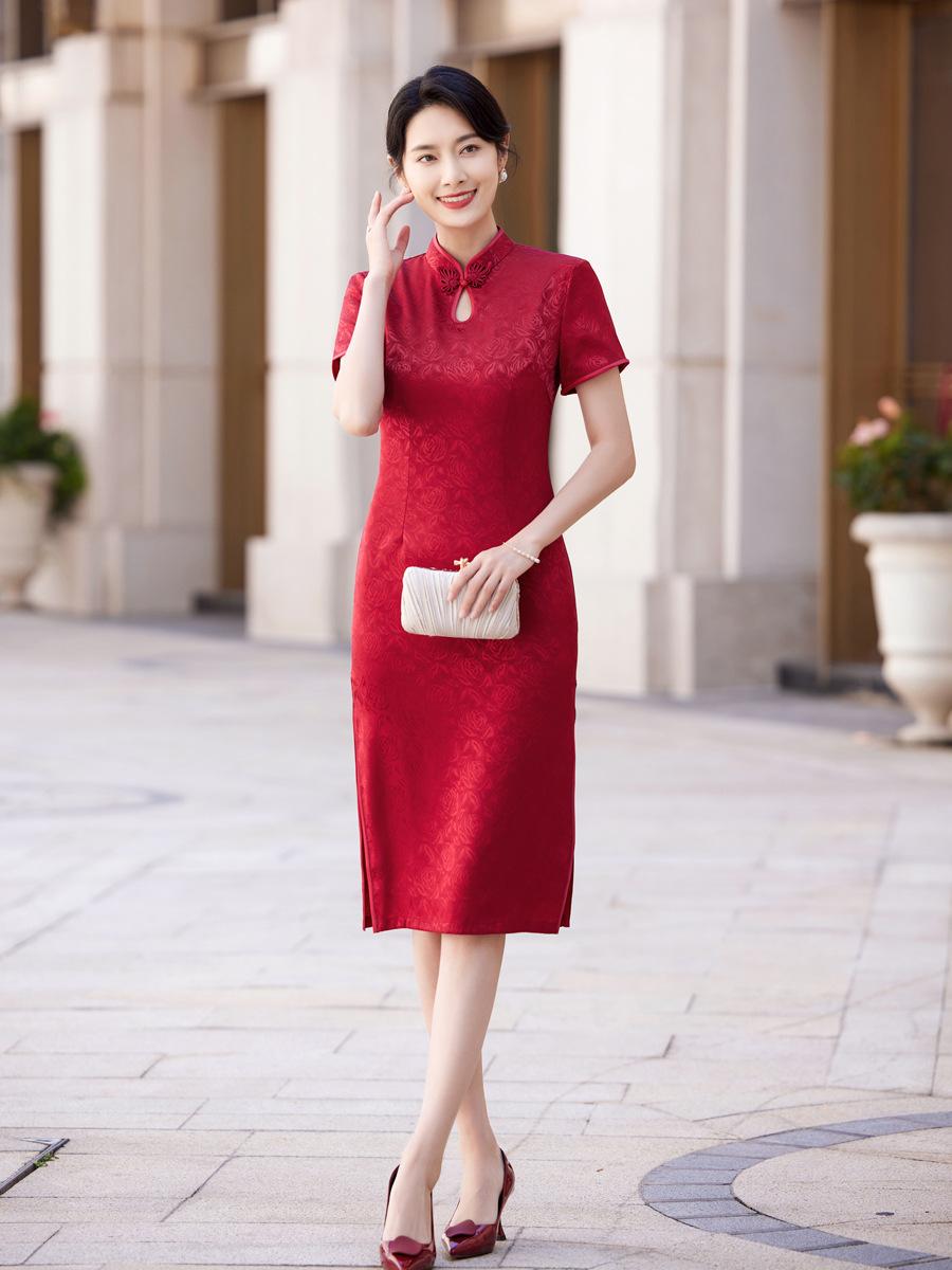 Vestido Cheongsam rojo Xi para mujer, vestido de boda para suegra, largo medio, cuello de gota de agua, manga corta, nuevo verano 2023
