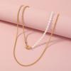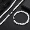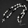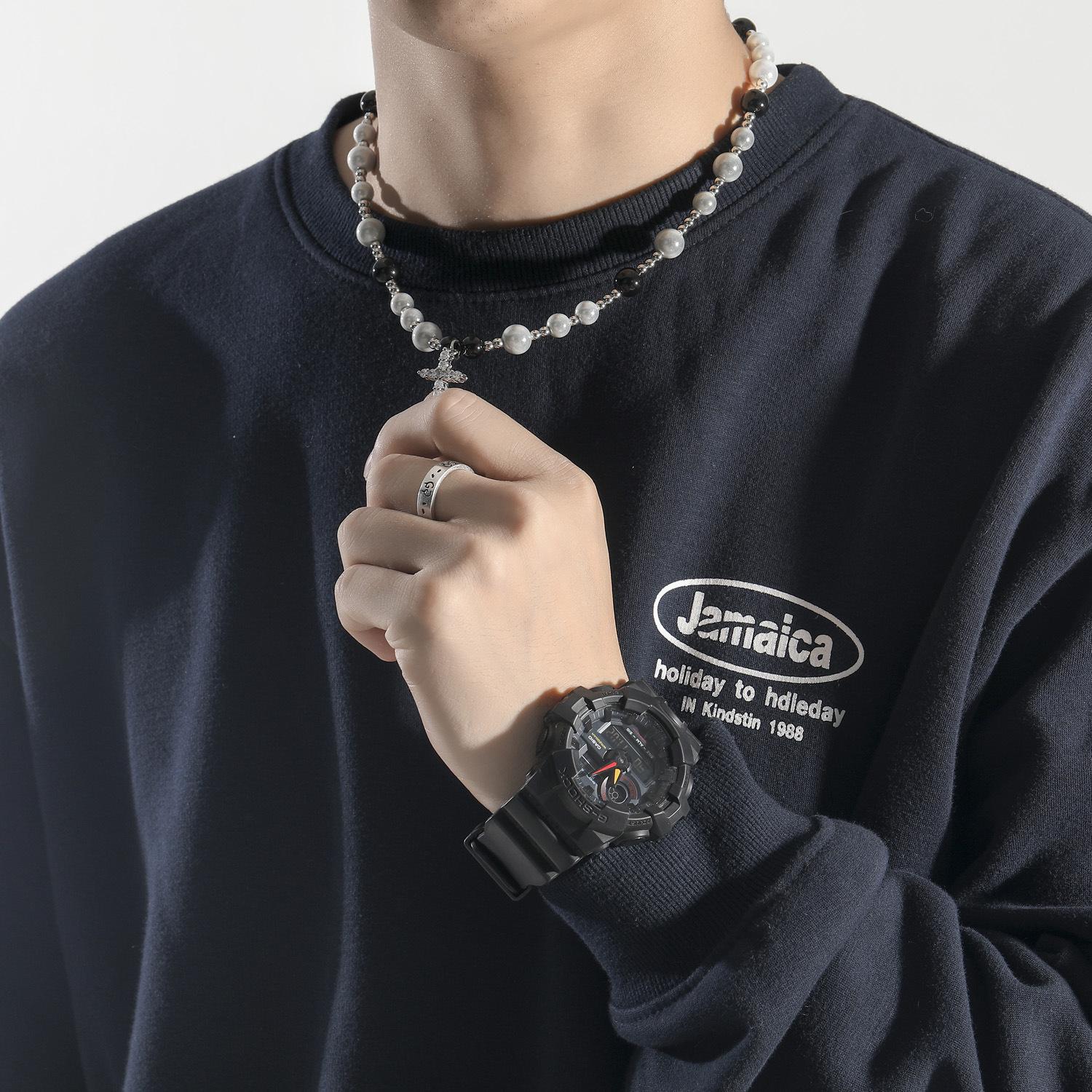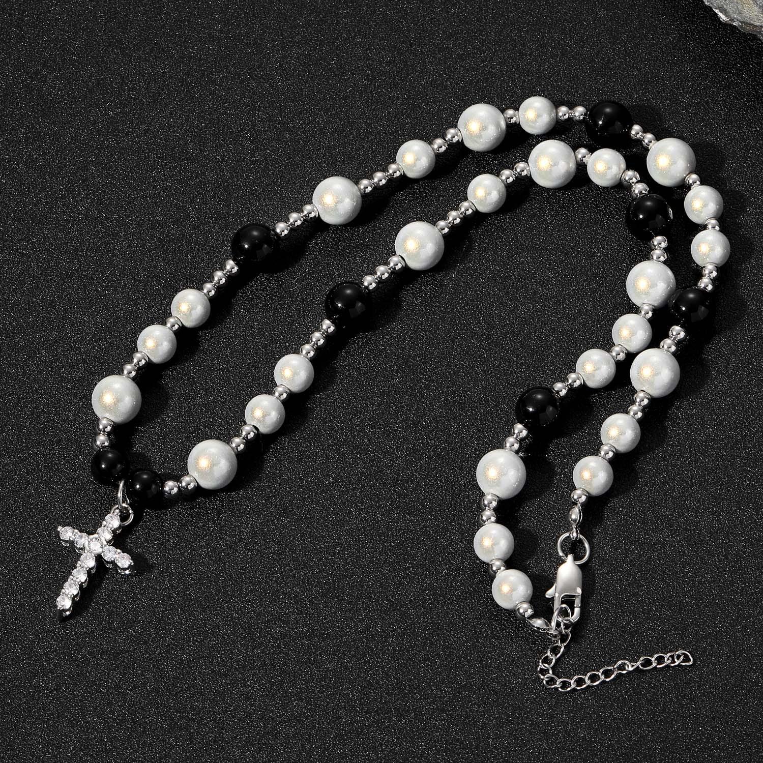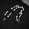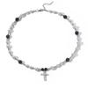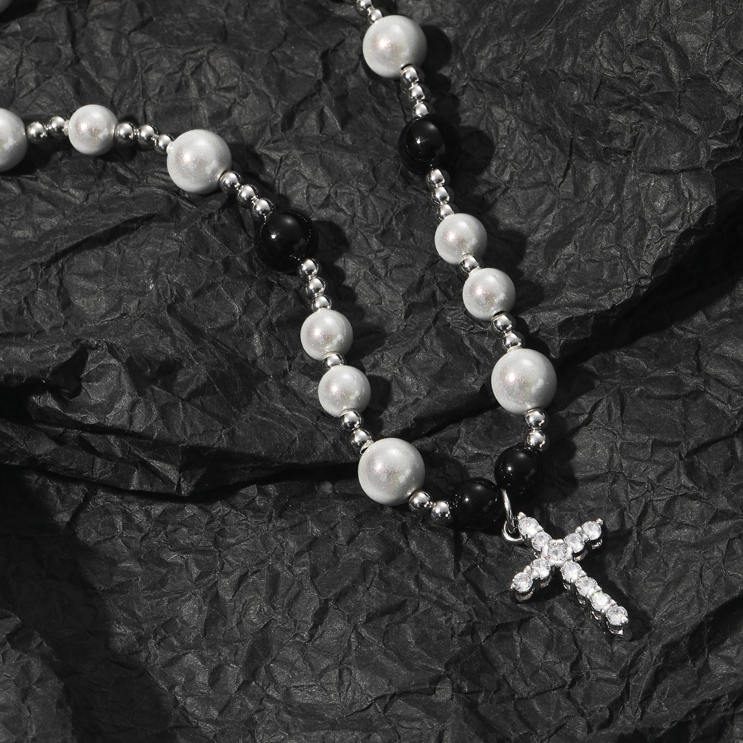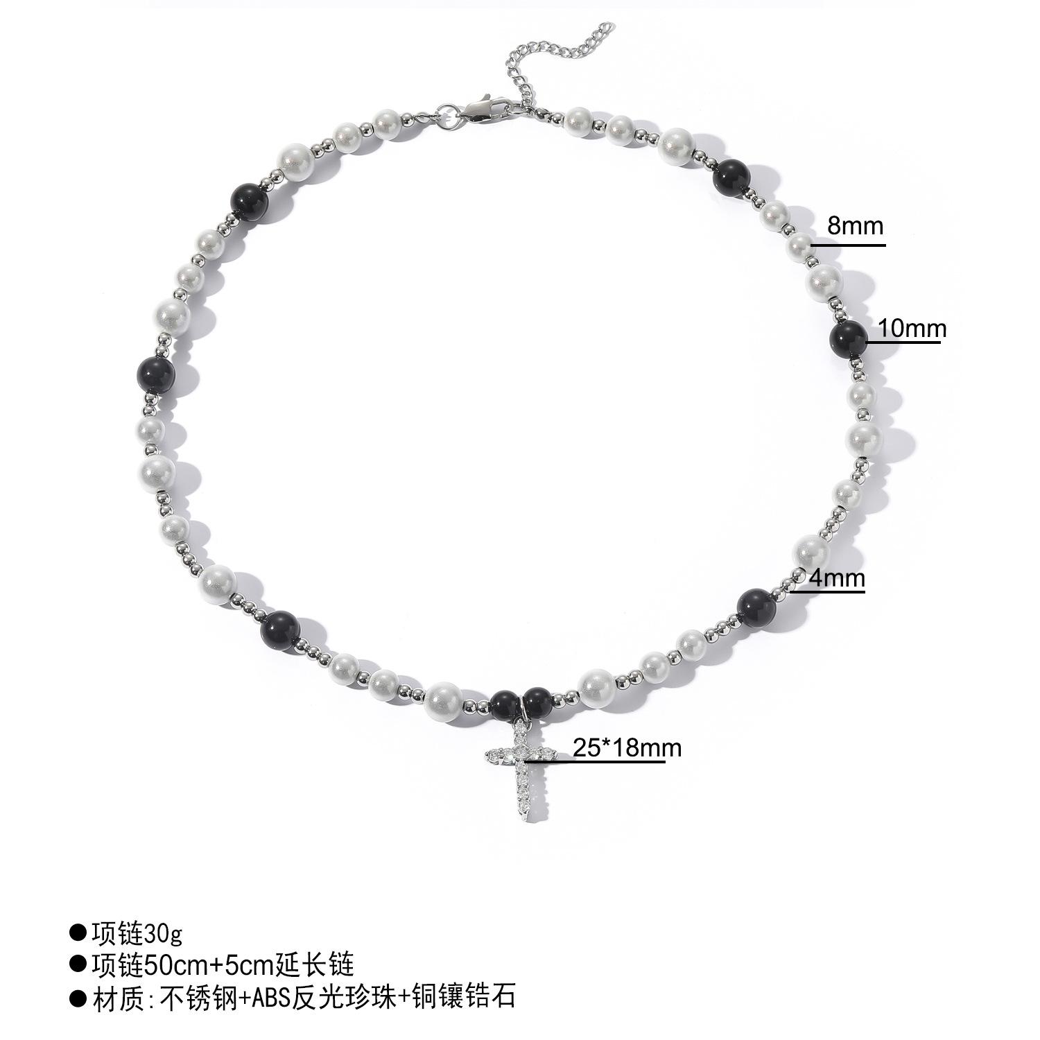 Collar de hip hop europeo y americano con cruz de perlas reflectantes en blanco y negro, cadena de clavícula de acero inoxidable con perlas ABS para hombre