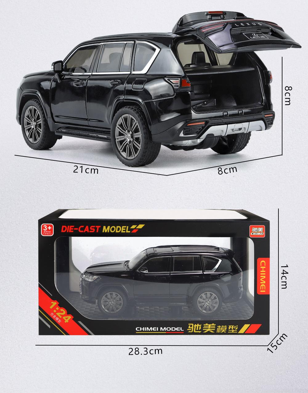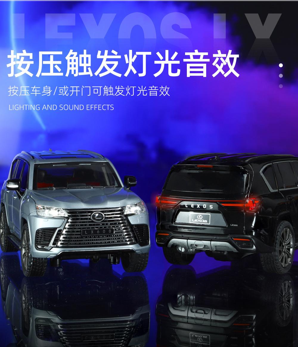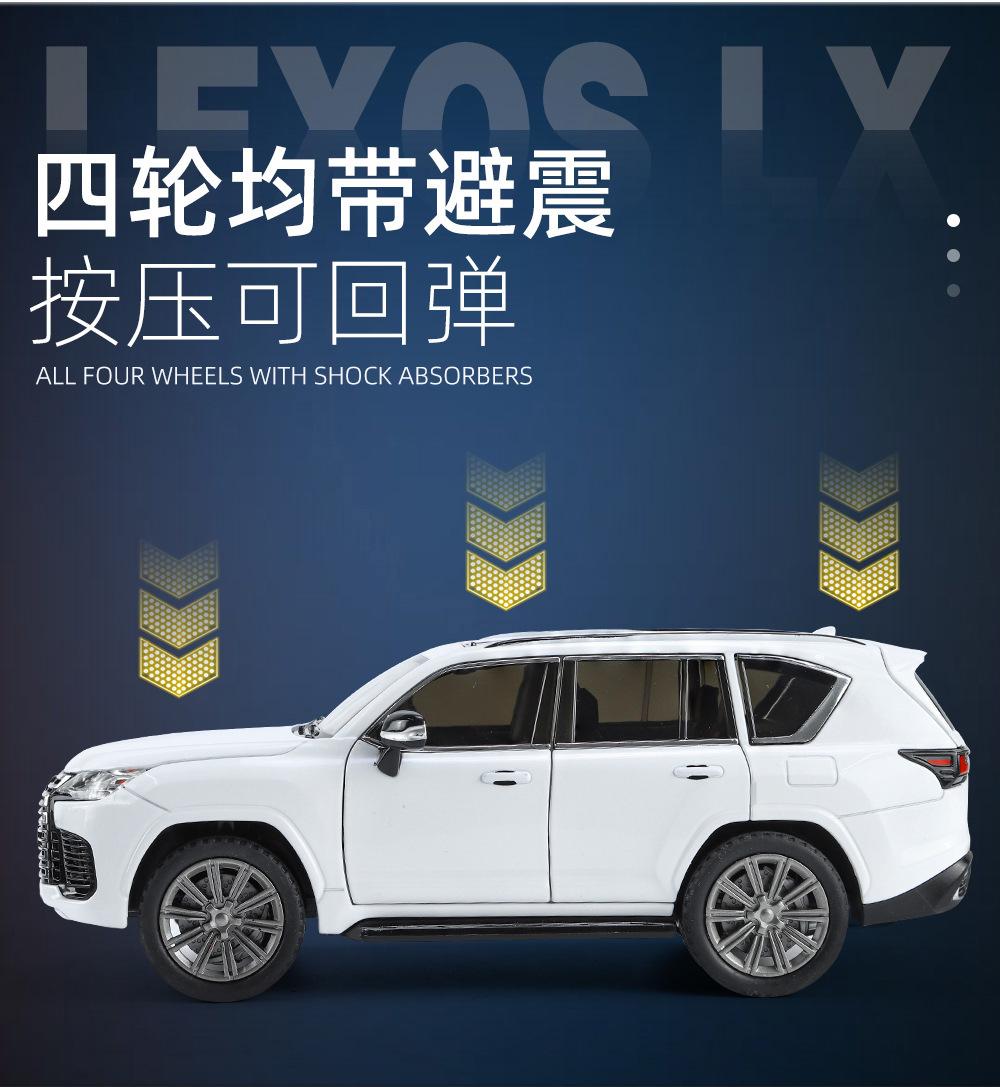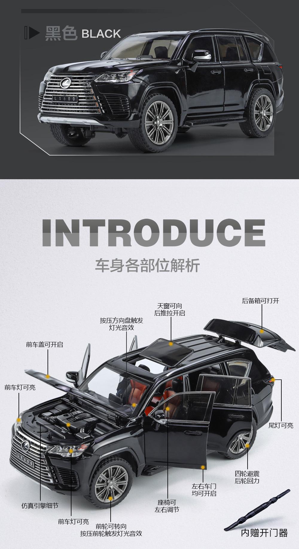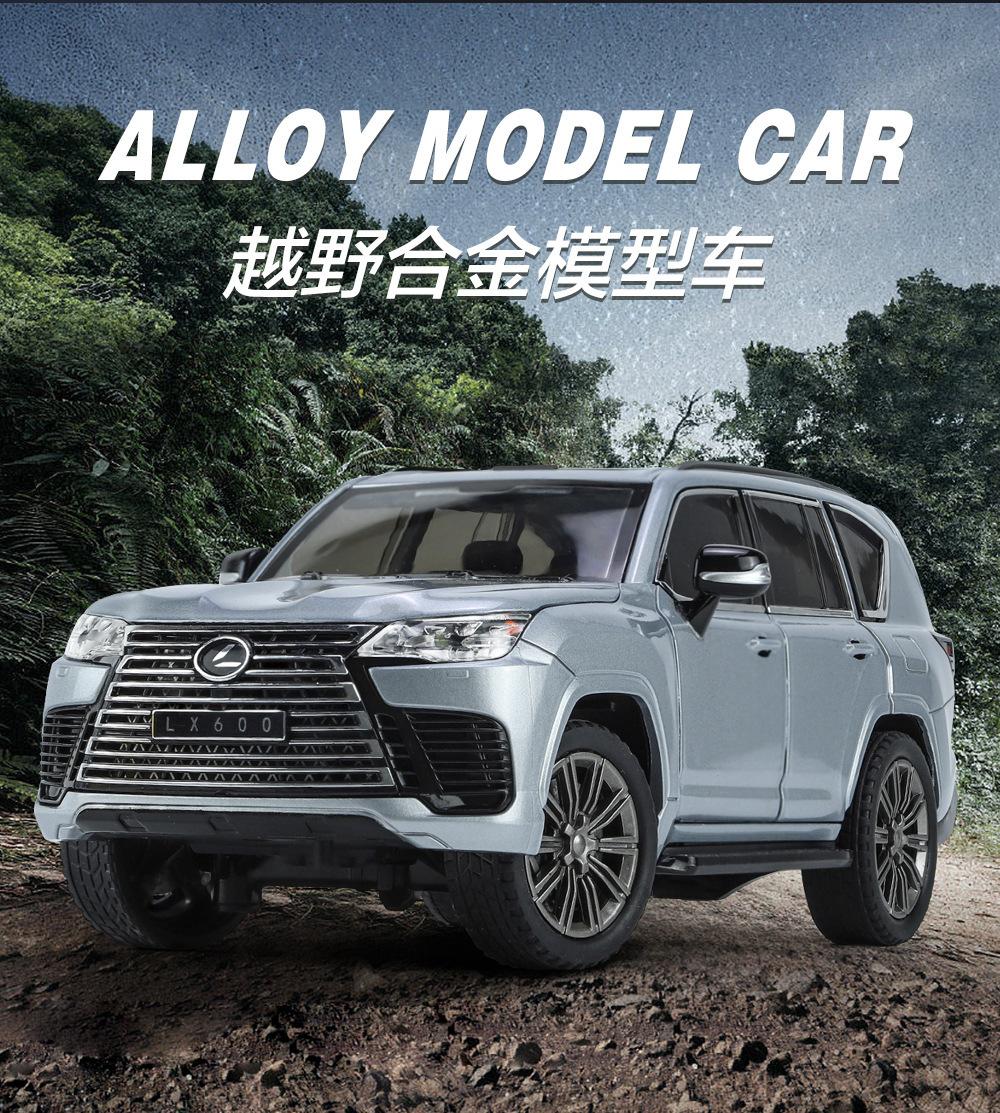 Coche de aleación Chimei Modelo 1: Vehículo todoterreno Lecker LX600 de 24 pulgadas con sonido y luz, modelo de coche de juguete con música y adornos.