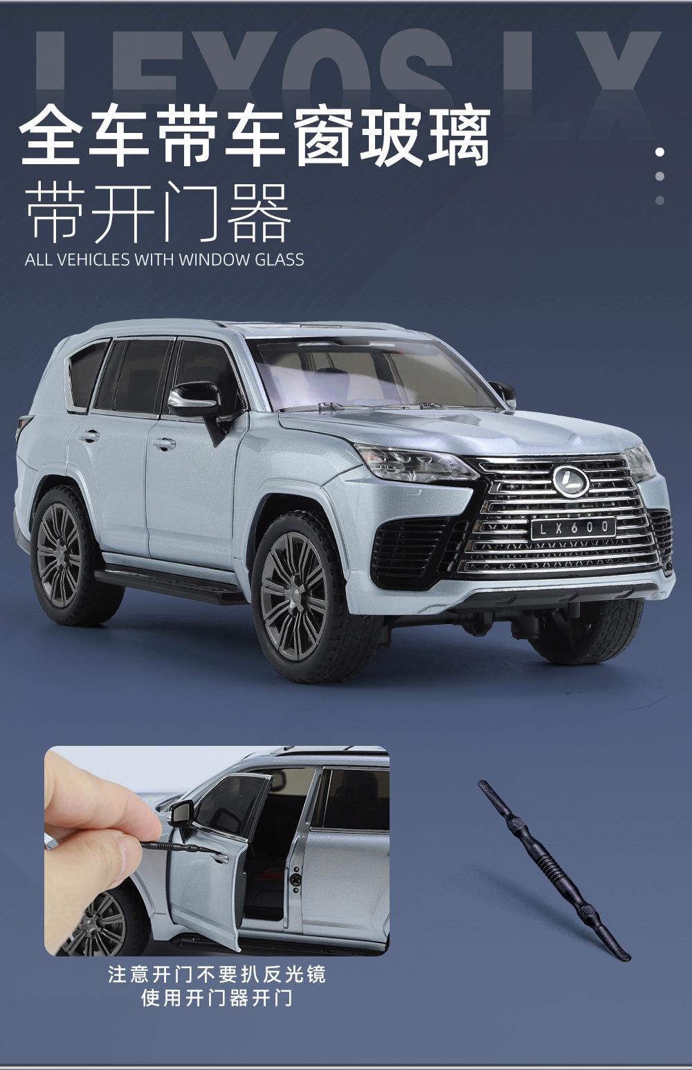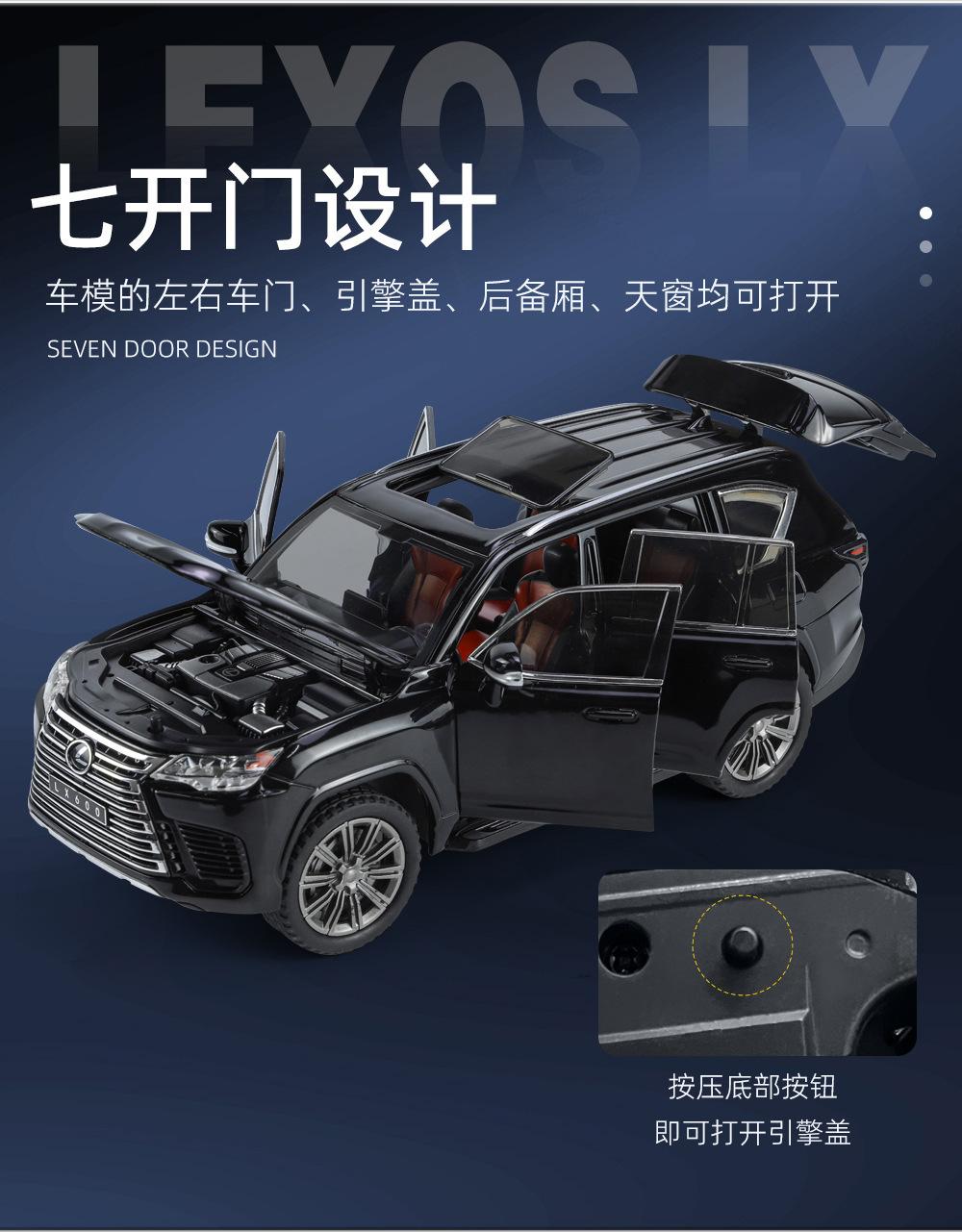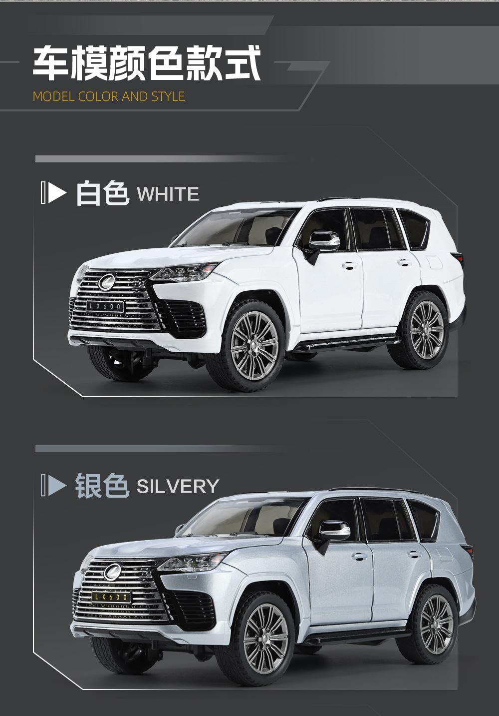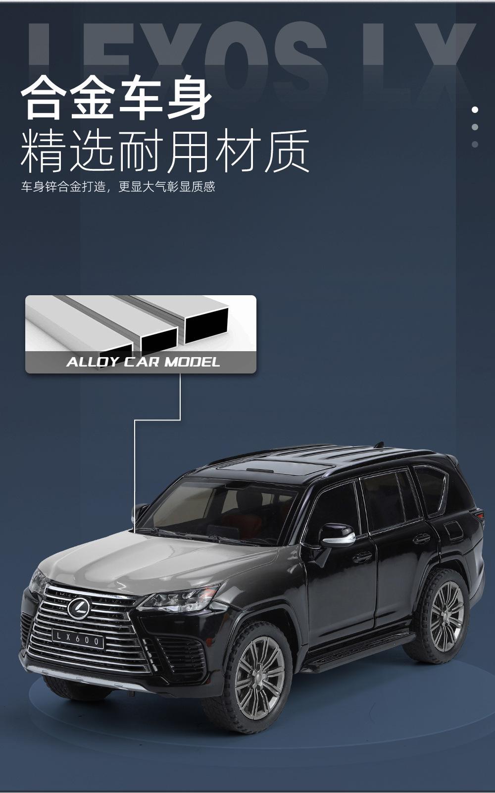 Coche de aleación Chimei Modelo 1: Vehículo todoterreno Lecker LX600 de 24 pulgadas con sonido y luz, modelo de coche de juguete con música y adornos.