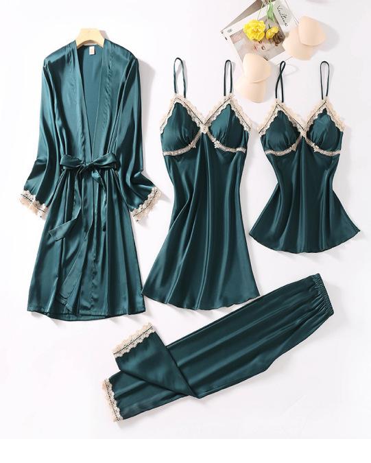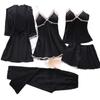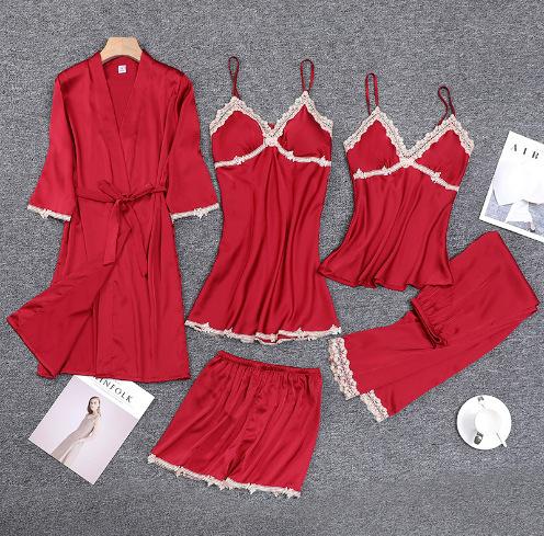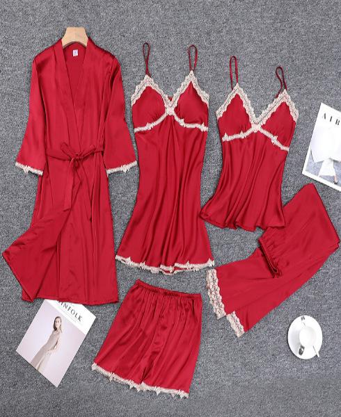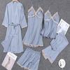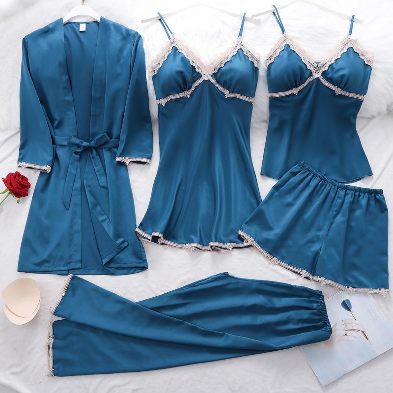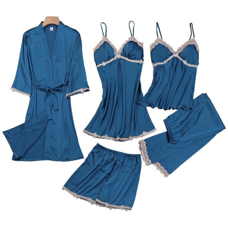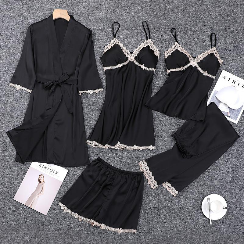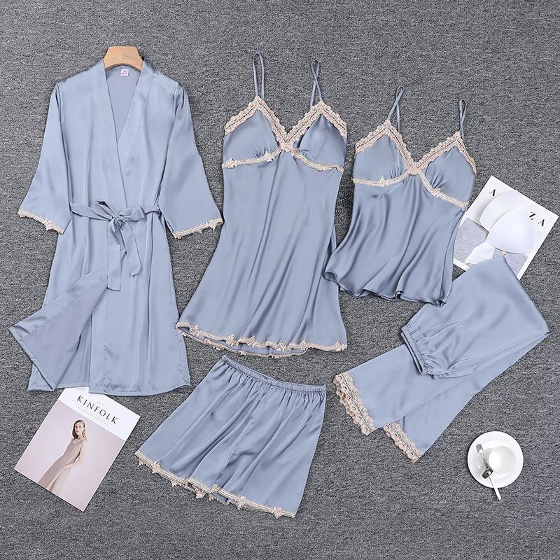 Pijamas de Primavera y Otoño para Mujer, Conjunto de Cinco Piezas de Camisola de Manga Larga y Pantalones Cortos de Seda de Hielo de Verano, Conjunto de Ropa de Dormir de Seda, Lujo Ligero
