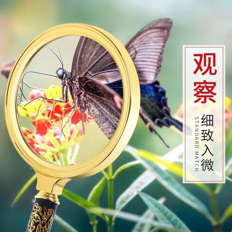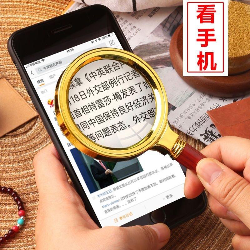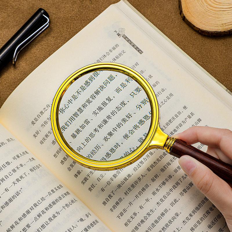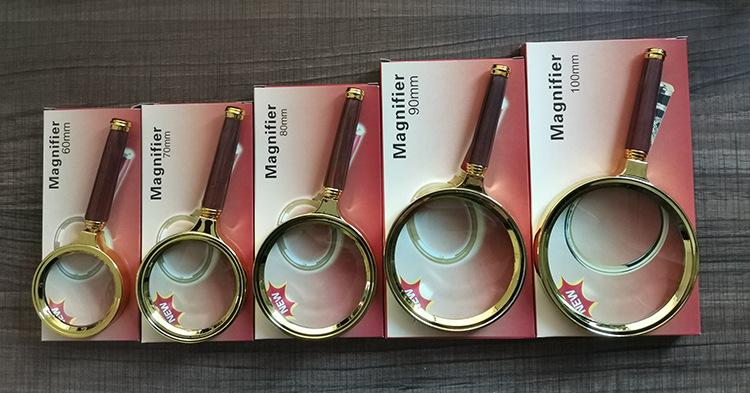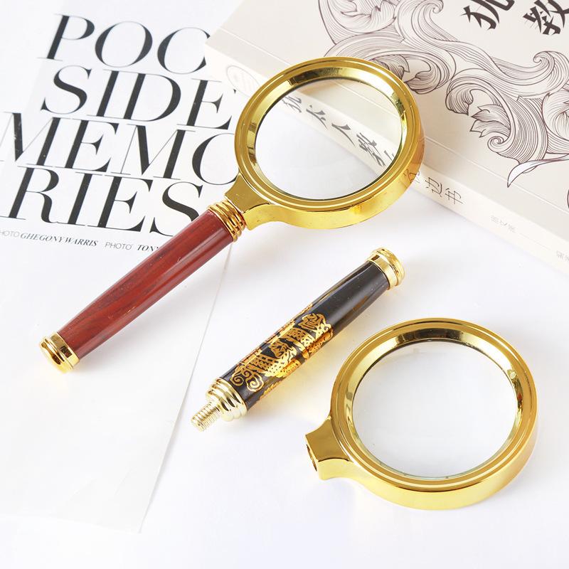 Material: Mango de plástico imitación caoba, lente de vidrio, marco de plástico ABS chapado en oro